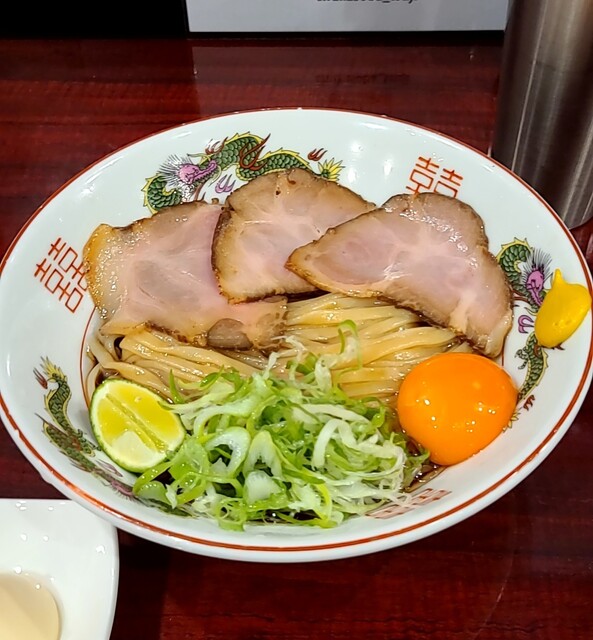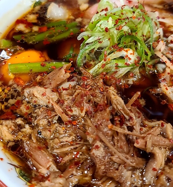 豚と鶏の濃い目の醤油清湯スープ‼️大量の背脂にニンニク、唐辛子が入った、スタミナ系のスープ、麺屋棣鄂の細麺を合わせて‼️