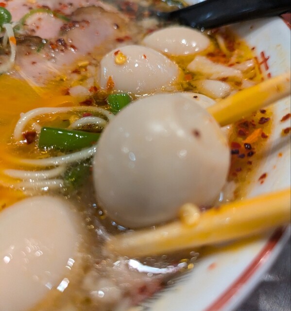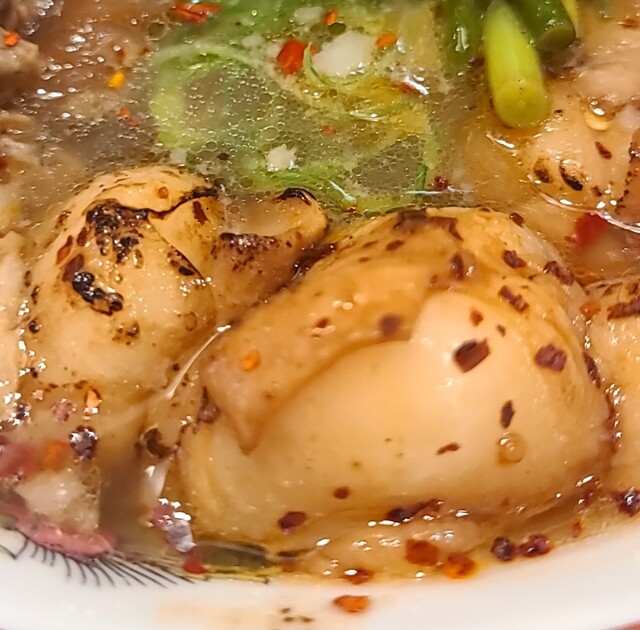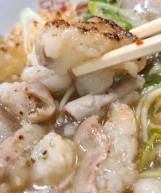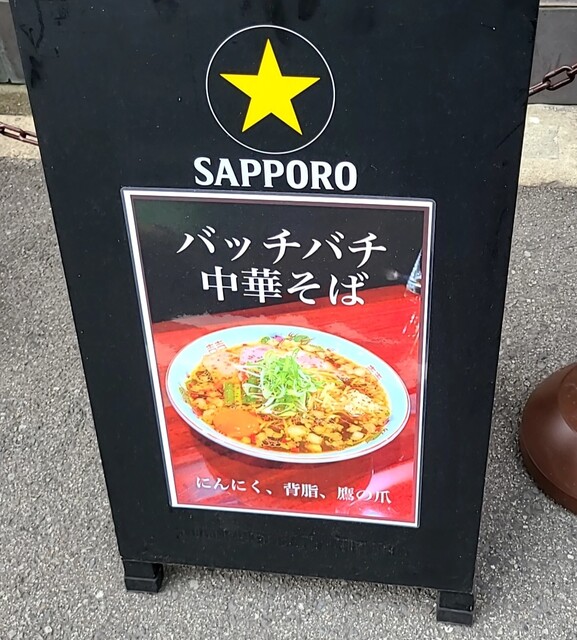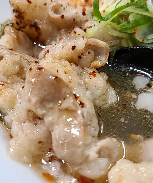 週末は通し営業になりましたね、時間も午後3時40分到着です。この時間でも結構なお客さんですね?今回は?バッチバチ牛ホル中華そば塩にパイカ(軟骨)トッピングです。本当はバチ朗にしようか迷いましたが?量が?スープは清湯スープに塩たれ、これだけならあっさりですが?大量の背脂、唐辛子、ニンニクガッツリなスタミナ系スープ、辛い臭い脂っこい美味しいスープです。麺は細麺、バッチバチスープが良く絡んで美味しいです。青ネギにニンニクの芽の風味も良く、卵黄崩してマイルドに、チャーシューは軟らかく肉肉しく美味しいです。牛ホルモン、プリっプリでジューシー、これはかなり美味しいですね。トッピングしたパイカ(軟骨)軟らかく煮込まれて、軟骨もとろとろです。辛い臭い脂っこいでも美味しい一杯でした。