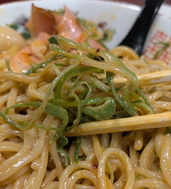水でしっかり〆られた平打ち中太麺、きれいに盛り付けられて、甘味と酸味のきいた冷たい醤油たれがかかり、ゴマ油、甘味と酸味のきいた冷たい醤油たれが平打ち中太麺に良く絡んで美味しいですね。