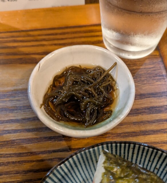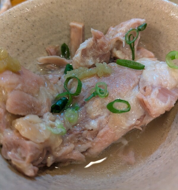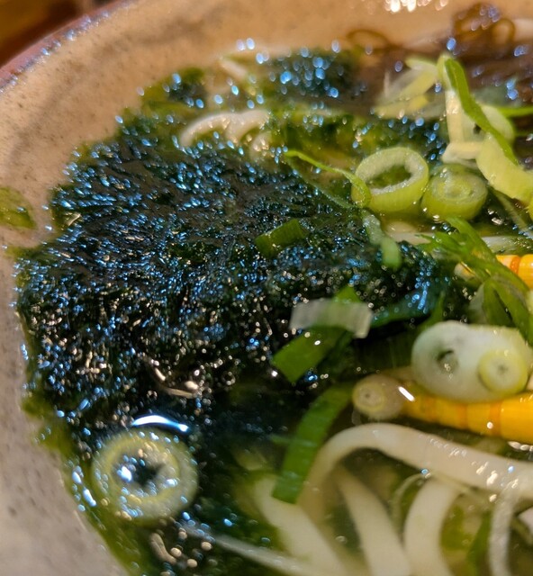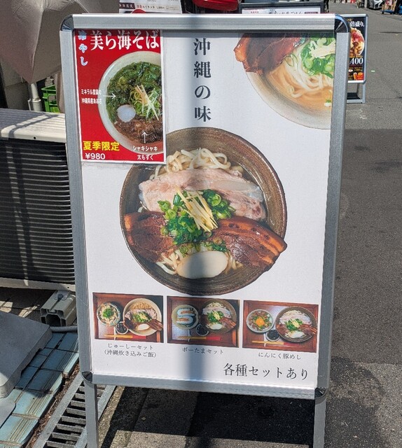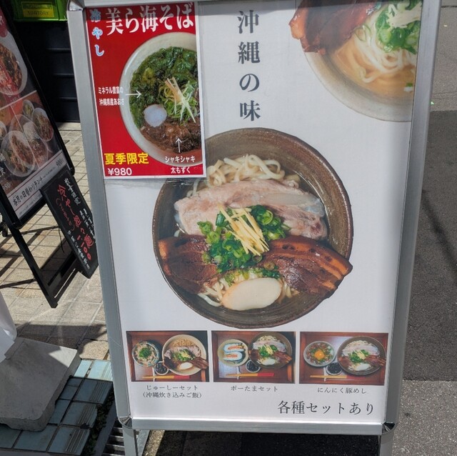 週末のお昼ご飯です。週末なので南船場はいつもよりは少し人も少ないように感じますが?時間も12時20分到着です。今月3回目の訪問になりますが?先客数名その後もぼちぼちお客さんです。やはり週末の方が空いてますね。今回は?もちろん暑いので。限定。冷やし美ら海そばです。別皿で塩軟骨6も頂いて。ついでにもずく酢も頂いちゃいました。スープは鰹昆布出汁に沖縄の塩、ぬちまーすを合わせて、アサリ煮干し、冷たく冷やされて。あっさり冷たい美味しいスープ。麺も水でしっかり〆られた特製に平打ち中太麺。あっさり魚介スープが良く絡んで美味しいですね。青ネギの食感も良く、生姜の風味も良いですね、かまぼこも美味しいです。途中で。頂いた島唐辛子を漬けたまるこめ酢頂いて。投入です。酸味に島唐辛子がピリッとこれ又美味しいです。太もずくも食感良く、島唐辛子漬けたまるこめ酢かけてちょいピリッとこれ又美味しいです。アーサーの風味も良いですね。別皿の塩軟骨ソーキ、軟骨とろとろ、塩身もちょうど良く美味しいです。青ネギが良いですね。ソーキには卓上のコーレグース投入、泡盛風味に島唐辛子がちょいピリッと又々美味しい。卓上のゆずこしょうもつけて、柚子風味が爽やかです。青唐辛子もちょいとピリッと又々美味しいです。とろとろ柔らか塩軟骨ソーキにあっさり冷たい美味しい一杯でした。