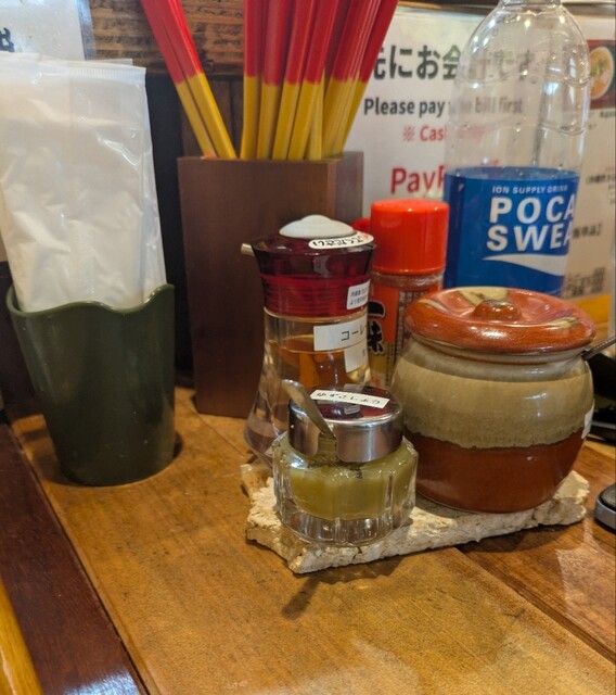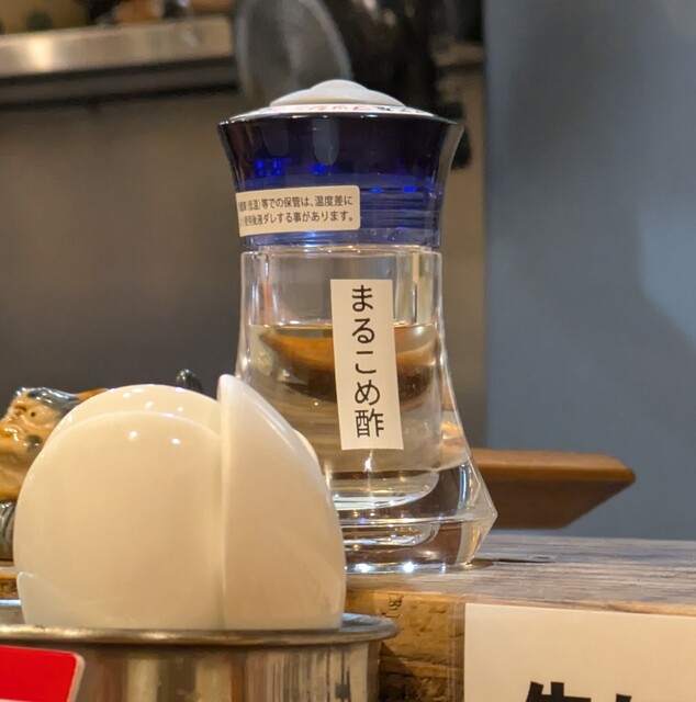 平日のランチタイムです。時間も12時ちょい過ぎです。南船場の街はオフィス街、たくさんのランチ難民が移動してます。もちろんここも大行列です。しばらく並んで待つ事に、約10分程で店内に、今回は?夏季限定。冷やし美ら海そばです。冷やしそばですね。一緒に別皿で塩軟骨ソーキも頂いて。スープは良く冷えた鰹昆布出汁にヨネマースの粗塩ぬちまーすを合わせて、アサリ煮干しに泡盛合わせた塩タレ、あっさりですが深い冷たい美味しいスープです。麺は特製の平打ち中太麺、水でしっかり〆られて、冷たい魚介スープが良く絡んで美味しいですね。青ネギの食感も良く、生姜の風味も良いですね。かまぼこも美味しいです。頂いたまるこめ酢入れると酸味でさっぱりこれ又美味しい。アーサーの風味も良く、太いもずく、食感良く風味も良く麺と一緒にこれ又美味しいです。別皿の塩軟骨ソーキ、軟骨とろとろ、柔らかくちょうどよい塩加減。卓上のコーレグース入れて、泡盛風味に島唐辛子がちょいとピリッと。あがあがこーれぐす〜もちょっと投入、やっぱり辛いです。でもくせになりますね。卓上のゆずこしょうもつけて、柚子風味に青唐辛子がちょいピリッと又々美味しいです。今年も頂けた天願の冷やし、冷たく風味良く美味しい一杯でした。