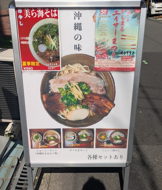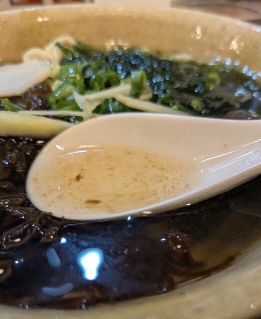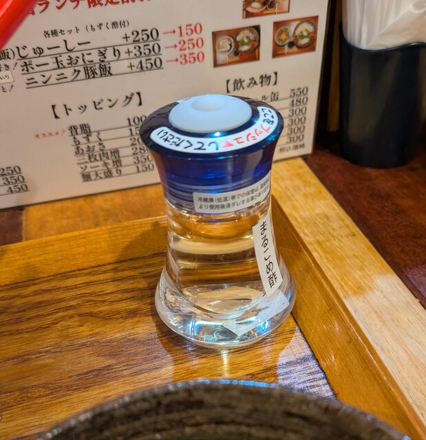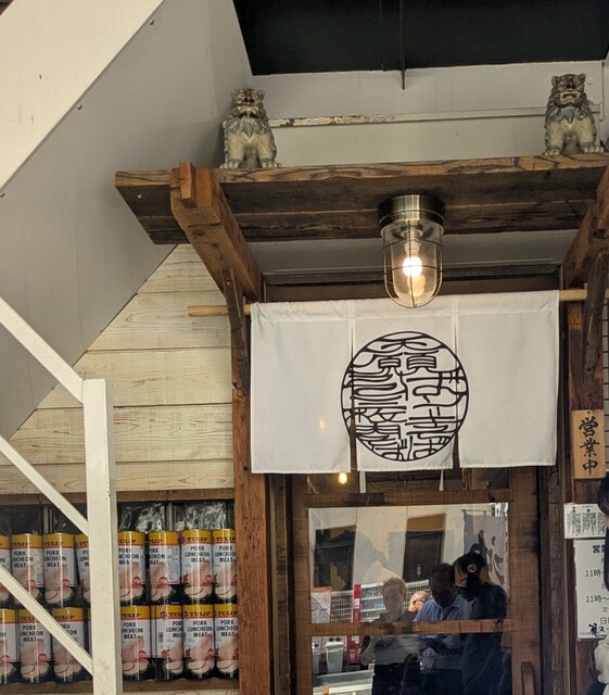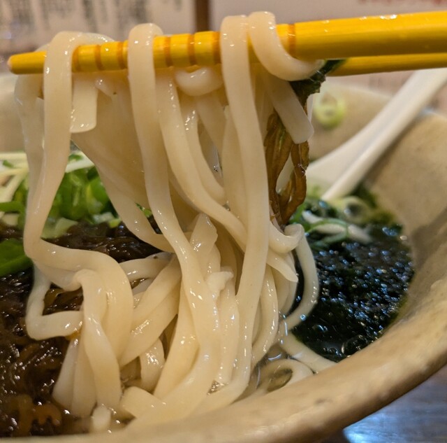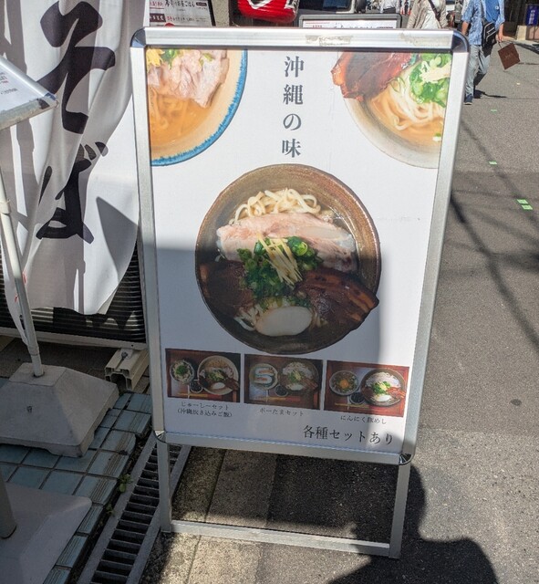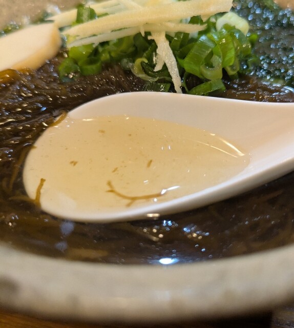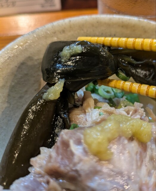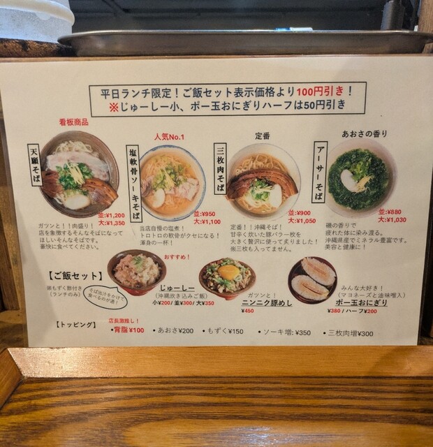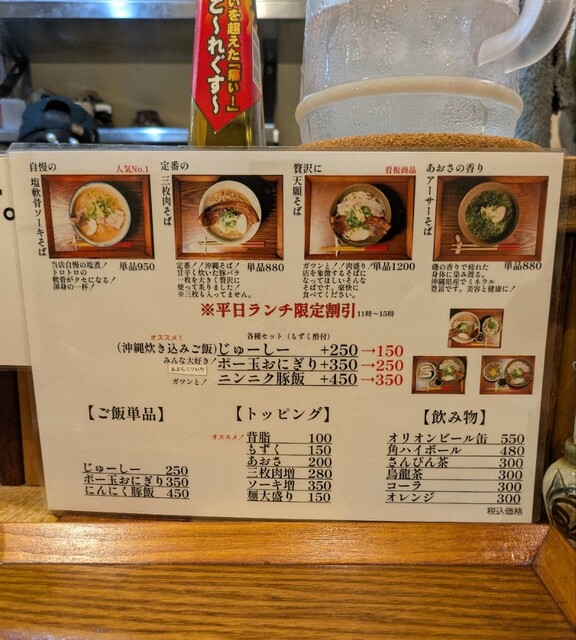 この日は最高気温何と25℃とかなり過ごしやすい陽気になりました。やっと秋を感じれる気温になりましたね。又々ランチでの訪問です。サラリーマンにOLさんが行き交う街南船場、時間も12時ちょい過ぎです。店頭は1人待ちが出てる状態、僕も後ろに並んで、約5分程で店内に。今回は?塩軟骨ソーキそばです。背脂もトッピングです。今回は一緒に?ポー玉おにぎりハーフも頂いて。10月よりハーフサイズもやってたので、ついつい頼んでしまいました。スープは鰹昆布出汁にアサリ煮干しを合わせて、沖縄の塩ぬちまーすを合わせたスープ、表面には背脂、あっさりですが出汁のきいた美味しいスープ、背脂のコクも重なりさらに美味しいです。麺特製の中太麺、喉越しの良い美味しい麺、鰹昆布出汁に背脂が良く絡んで美味しいです。青ネギの食感良く、生姜風味も良いですね。結び昆布も出汁が染みてこれ又美味しいです。卓上のコーレグース入れて泡盛風味に島唐辛子がちょいとピリッと美味しいです。塩軟骨ソーキも軟骨とろとろ塩身もちょうど良く美味しいです。ポー玉おにぎりハーフ。ご飯に海苔が巻かれて、スパムに薄焼き玉子です。甘めの味噌にマヨネーズ、ちょうど良い味付でご飯が進む美味しいです。添えてあるもずく酢、甘味と酸味のバランス良く美味しいもずく酢です。最後はスープと塩軟骨ソーキにゆずこしょうつけて、柚子風味に青唐辛子ちょいとピリッと又々美味しいです。マヨネーズのきいた美味しいおにぎりに、鰹昆布出汁にとろとろソーキの美味しい1杯でした。