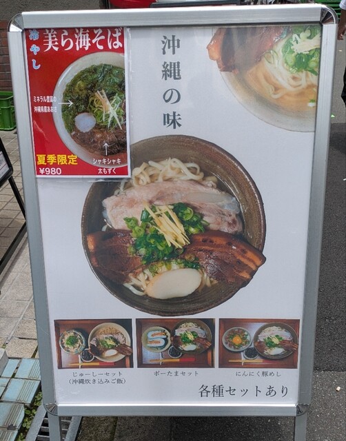 平日のランチタイムです。この日は気温36℃かなり暑い中ランチに向かいます。歩いているだけで汗だくです。12時ちょうど店頭は行列です。暑い日は並ぶのも大変ですが?5分程で店内に。今回は?もちろん夏季限定、冷やし美ら海そばです。別皿で塩軟骨ソーキも頂いて。スープは冷たい鰹昆布出汁にアサリ煮干し、沖縄の塩ぬちまーすを合わせた、冷たいあっさり美味しいスープ、麺は水でしっかり〆られた特製の平打ち中太麺、冷たい魚介スープ良く絡んで美味しいです。青ネギの食感も良く、生姜の風味も良いですね。頂いた島唐辛子漬けのまるこめ酢投入、酸味でさっぱり、島唐辛子がちょいピリッとこれ又美味しいです。アーサーの風味良く太もずく、島唐辛子漬けまるこめ酢でピリ辛もずく酢に。又々美味しいです。塩軟骨ソーキは軟骨とろとろ塩身もちょうど良く美味しいです。添えてあるむすび昆布も良いですね。ゆずこしょうつけてこれ又美味しいです。塩軟骨ソーキにもコーレグースかけて泡盛風味に島唐辛子ピリッとこれ又美味しい。卓上のゆずこしょうもつけて、柚子さっぱり、青唐辛子がピリッと又々美味しいです。冷たいあっさり美味しい一杯にとろとろ軟骨の美味しいソーキでした。
