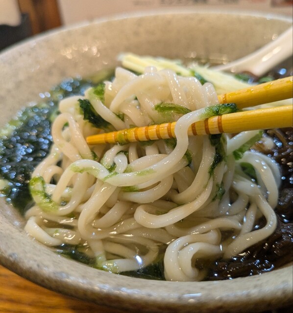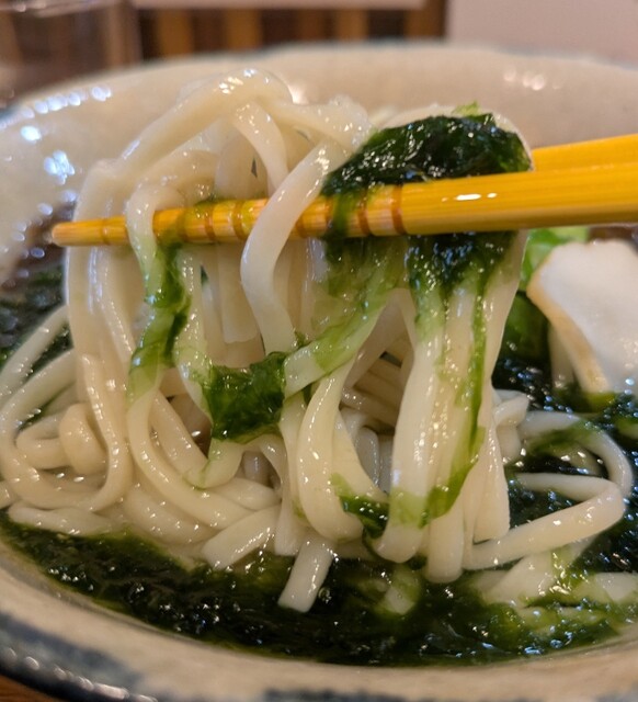 平日のランチタイムです。時間も12時20分到着、行列無し、すぐに入れてラッキーです。賑わう店内。今回は?もちろん暑い日に美味しい?夏季限定?冷やし美ら海そばです。別皿で塩軟骨ソーキも頂いて。スープは冷たい鰹昆布出汁に沖縄の塩、ぬちまーすを合わせて、アサリ煮干しです。旨味しっかり冷たい美味しいスープ。麺は特製の水でしっかり〆られた、平打ちの中太麺。喉越し良く、冷たい鰹昆布出汁スープが良く絡んで美味しいです。青ネギの食感良く、生姜風味もいいですね。頂いた島唐辛子を漬けたまるこめ酢投入、島唐辛子でちょいとピリッと、お酢でマイルドにこれ又美味しいです。アーサーの風味も良く、太もずくの食感良く、島唐辛子入りまるこめ酢かけてちょいピリッとこれ又美味しいです。塩軟骨ソーキにはなんとむすび昆布もサービスして頂いて、これ懐かしい、島にいるときは良く食べてました。塩軟骨ソーキも軟骨とろとろ、塩身もちょうど良く美味しいです。卓上のコーレグースかけて、泡盛風味に島唐辛子がピリッとこれ又美味しいです。夏にぴったり冷たい美味しい一杯にとろとろ柔らかい美味しいソーキでした。
