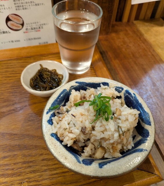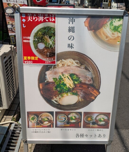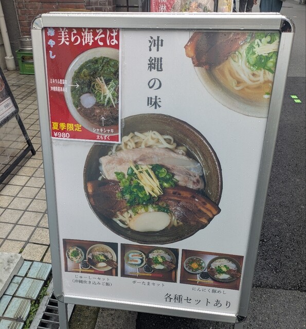 平日のランチタイムです。時間もちょうど12時です。気温36℃の猛暑の中、南船場までやって来ました。ランチ難民のサラリーマンにOLさんも大量にいます。店頭は行列ですね。やはり、約5分程で店内に、今回は?暑いので、夏季限定、冷やし美ら海そばです。別皿で塩軟骨ソーキも頂いて。そして今回は。沖縄尚学、甲子園優勝記念。じゅーしー無料です。じゅーしーも頂いてしまいました。スープは冷たい鰹昆布出汁にアサリ煮干し、沖縄の塩ぬちまーすを合わせて、あっさりですが旨味のある冷たい美味しいスープ。麺は水でしっかり〆られた特製の平打ち中太麺。冷たい鰹昆布出汁スープが良く絡んで美味しいです。青ネギの食感良く生姜風味も良いですね。かまぼこも美味しいです。頂いたまるこめ酢入れて、ちょいと酸味がさっぱりさらに美味しいです。アーサーの風味も良く、太もずくはまるこめ酢かけて、ちょいと酸味、もずく酢ん8又々美味しいです。無料のじゅーしー、沖縄の炊き込みご飯、香ばしく出汁がきいてて美味しいです。もずく酢も甘味と酸味のバランス良く又々美味しいもずく酢ですね。塩軟骨ソーキは軟骨とろとろ、塩身も程よく美味しいです。卓上のコーレグースかけて、ちょいとピリッと泡盛風味も良いですね。卓上のゆずこしょうもつけて、柚子風味でさっぱりと、青唐辛子もちょいとピリッと又々美味しいです。沖縄尚学甲子園優勝記念のじゅーしーに冷たい美味しい一杯、とろとろ軟骨の美味しいソーキでした。