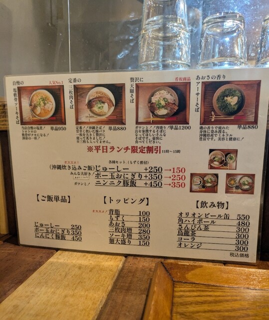 師走の平日のお昼です。午後1時半過ぎです。ちょいと遅れたお昼ご飯です。この時間なので、行列無くすぐに入れましたが、何と店内は結構な賑わいです。今回は?塩軟骨ソーキそば、背脂トッピングですそして、本町店が1周年イベントのジューシー無料でジューシーも頂いて。スープは鰹昆布出汁にアサリ煮干し、沖縄の塩ぬちまーすを合わせたあっさりスープ、背脂のコクもプラスされた美味しいスープです。麺は平打ちの特製の中太麺、喉越し良く、鰹昆布出汁に背脂が良く絡んで美味しいです。青ネギの食感も良く、生姜の風味も良いですね。かまぼこも美味しいです。頂いた旨辛ペースト、島唐辛子の泡盛漬け、独特な風味で結構ピリッと美味しいです。結び昆布も味がしゅんで美味しいです。卓上のコーレグースかけて、泡盛風味に島唐辛子がピリッとこれ又美味しいです。中央の塩軟骨ソーキ、軟骨とろとろ、塩身もちょうど良く美味しいです。沖縄の炊き込みご飯ジューシーも程よい味付、青ネギの食感良く美味しいです。もずく酢の甘味に酸味、バランス良くこれ又美味しいです。卓上のゆずこしょうも入れて、柚子風味に青唐辛子がピリッと又々美味しいです。最後はジューシーに塩軟骨ソーキそばのスープ投入、サラサラっとこれ又美味しいです。あっさりスープに背脂のコク、ジューシーも一緒に美味しい一杯でした。