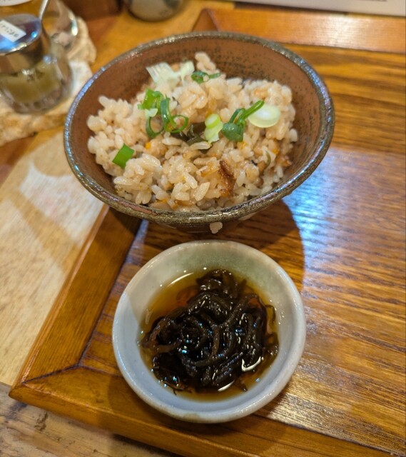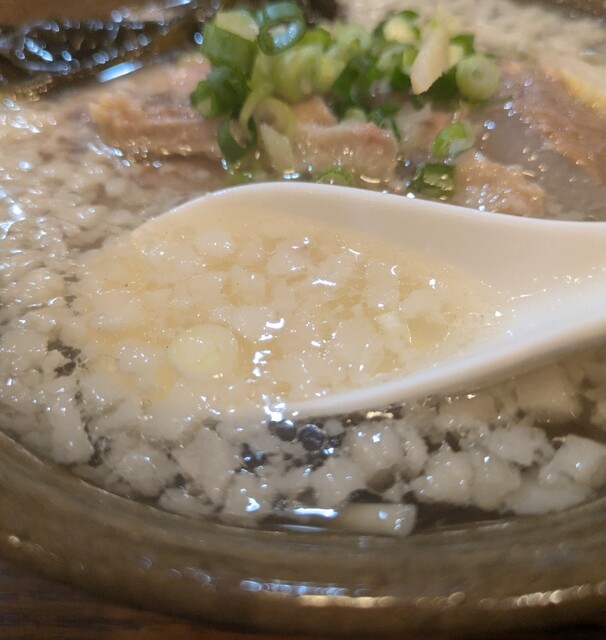 10月31日、Happy ハロウィンですね。雨が降って南船場の街はそんな雰囲気はしませんが?多分夜になると仮装したパーリーピーポーが大勢街に出てくるでしょうが?そんな雨の南船場でランチタイムです。時間も12時ちょい過ぎです。店頭はもちろん行列です。最後尾に並んで、その後も行列が伸びて行きますね。10分程で店内に。今回は?塩軟骨ソーキそば、背脂トッピング、さらにじゅーしー小も頂いて。スープは鰹昆布出汁にアサリ煮干し、沖縄の塩ぬちまーすを合わせたあっさりスープ、表面には背脂、あっさりですが背脂のコクが加わる美味しいスープ。特製の平打ち中太麺、喉越し良く、あっさり鰹昆布出汁に背脂が良く絡んで美味しいです。青ネギの食感良く生姜風味も良いですね。かまぼこも美味しいです。卓上のコーレグース投入、泡盛風味に島唐辛子がちょいとピリッと美味しいです。結び昆布も味がしゅんでこれ又美味しいですね。大きな塩軟骨ソーキ、軟骨とろとろ、塩身もちょうど良く美味しいです。じゅーしーは沖縄の炊き込みご飯、ちょうど良い味付でおこげも香ばしく美味しいです。もずく酢が甘味と酸味のバランス良く、お酢まで飲み干せるほど美味しいです。卓上のゆずこしょう投入です。柚子風味に青唐辛子がちょいとピリッと又々美味しいです。塩軟骨ソーキにゆずこしょう、これが良く合って又々美味しいです。最後はスープをじゅーしーに投入、雑炊風に、鰹昆布出汁に背脂、じゅーしーが良く進む美味しいです。鰹昆布出汁に背脂、とろとろ塩軟骨ソーキに香ばしいじゅーしーの美味しいランチでした。