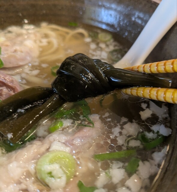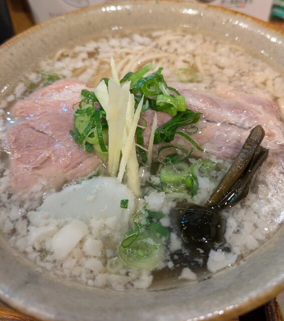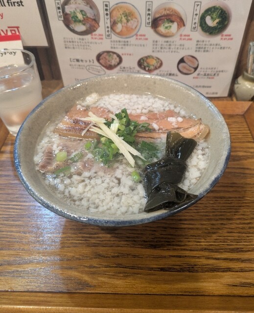 ついに10月、朝晩はちょいと涼しいような気がしますが?お昼はまだまだ残暑ですね。そんな10月の1杯目です。サラリーマンやOLさんがランチで賑わう街、南船場です。もちろん店頭は行列ですが、回転良く5分くらいで店内に。夏季限定の冷やしは9月いっぱいまででしたが?今回は?久々、塩軟骨ソーキそばです。もちろん背脂もトッピングです。スープは鰹昆布出汁にアサリ煮干し合わせて沖縄の塩ぬちまーすを合わせたスープ、あっさりですが背脂のコク、旨味しっかり美味しいスープです。麺は特製の中太麺、程よいコシで、鰹昆布出汁に背脂が良く絡んで美味しいです。青ネギの食感良く生姜の風味も良いですね。かまぼこも美味しいです。卓上のコーレグースもかけて、泡盛風味に島唐辛子がちょいとピリッとこれ又美味しいです。結び昆布も程よい味付、塩軟骨ソーキが軟骨とろとろ柔らかくボリューミーで又々美味しいです。卓上のゆずこしょうもつけて、青唐辛子ピリッと柚子風味でさっぱりと又々美味しいです。もちろん塩軟骨ソーキに結び昆布にもゆずこしょう、風味良くちょいとピリッと又々美味しいです。久々の塩軟骨ソーキそば、とろとろ軟骨に旨味しっかり鰹昆布出汁の美味しい一杯でした。