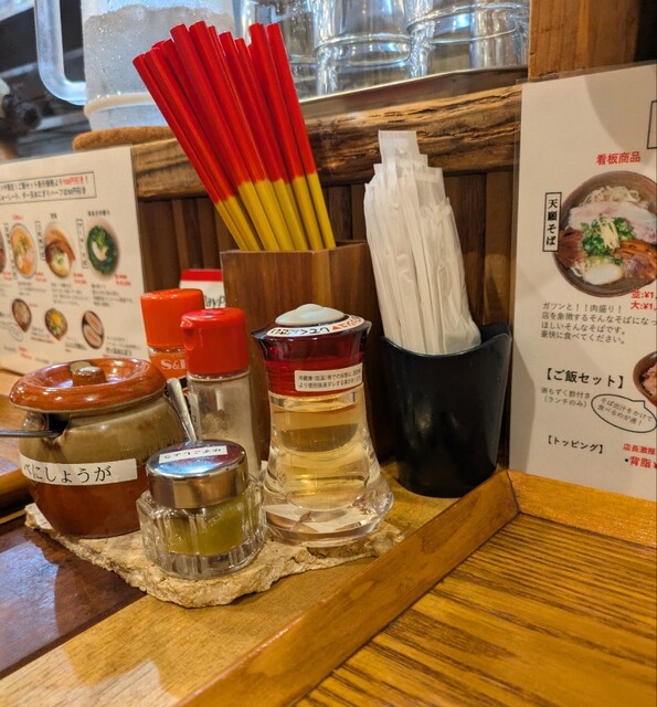 もうかなり寒く朝晩は気温も10℃以下です。朝起きるのもちょいとおっくになった今日この頃です。時間も午後12時ちょい過ぎです。ランチタイムでサラリーマン、OLさんがひしめく南船場ですね、店頭はもちろん行列です。店頭のメニュー確認して最後尾に並んで、約10分程で店内に。賑わう店内、今回は?ちょいと贅沢に天願そばです。もちろん背脂もトッピングです。スープは鰹昆布出汁にアサリ煮干し、沖縄の塩ぬちまーすを合わせて、表面には大量の背脂、鰹昆布出汁に程よい塩身のあっさりスープに背脂のコクも重なる美味しいスープ。特製の平打ち中太麺、鰹昆布出汁に背脂が良く絡んで美味しいです。青ネギの食感良く、針生姜も風味良く美味しいです。かまぼこも美味しいですね。卓上のコーレグース投入、泡盛風味に島唐辛子がちょいとピリッとこれ又美味しいです。結び昆布も味が良くしゅんで美味しいです。三枚肉も炙ってあるので香ばしく、脂身ジューシー美味しいです。塩軟骨ソーキgs柔らかく軟骨とろとろ塩身も程よくこれ又美味しいです。今回は泡盛漬けの島唐辛子ペースト頂いて、ちょっとだけ入れて、かなりピリッとでも癖になる美味しいピリ辛です、最後は卓上のゆずこしょう投入、さっぱり柚子に青唐辛子がちょいとピリッと又々美味しいです。塩軟骨ソーキに三枚肉の贅沢で美味しい一杯でした。