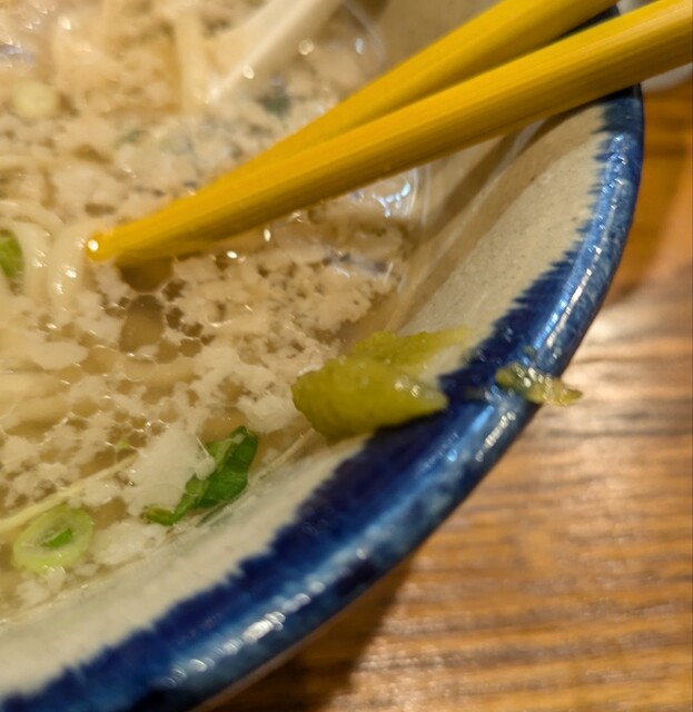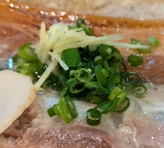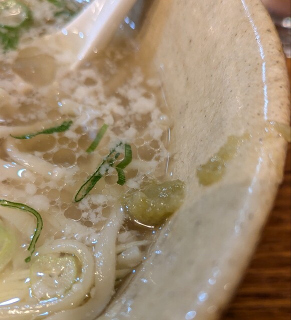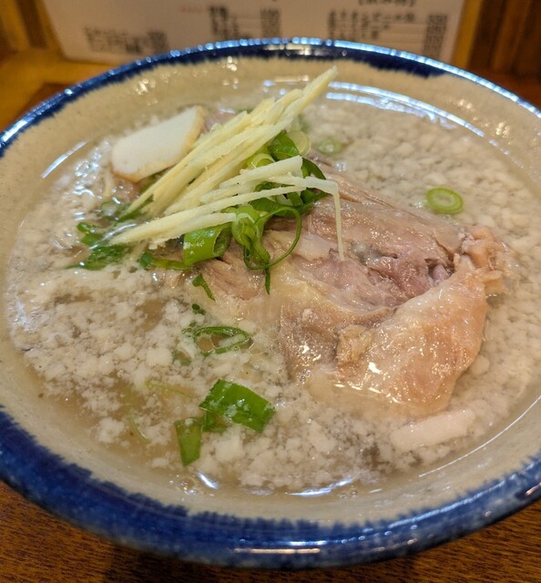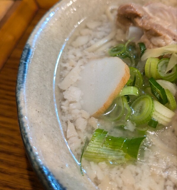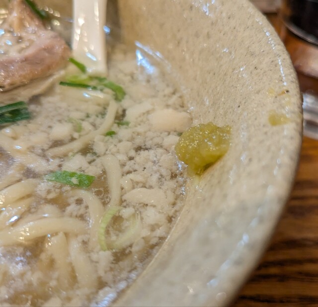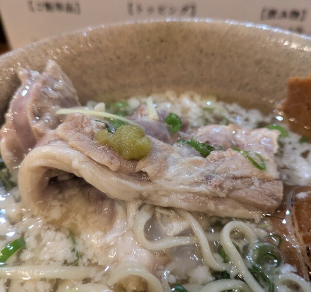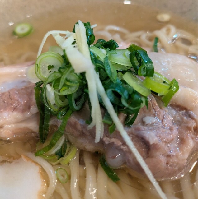 週末のお昼ごはんです。時間もちょいよ早めの11時20分到着です。すでにお客さん、2席だけあいてました。今回は?塩軟骨ソーキそばです。背脂はまだ仕込み中とのことで今回は無しです。スープは鰹昆布出汁にアサリ煮干し、沖縄の塩ヨネマースの粗塩ぬちまーすを合わせて。あっさりですが魚介の旨味しっかり美味しいスープです。麺は特製の平打ち中太麺。魚介スープが良く絡んで美味しいですね。青ネギの食感良く、生姜風味も美味しいです。かまぼこも良いですね。そして中央の大きな塩軟骨ソーキ。軟骨とろとろ、塩身も程よく美味しいです。卓上のコーレグース入れて、泡盛風味に島唐辛子gsピリッと美味しいです。卓上の柚子胡椒も入れて柚子風味にちょいとピリッとこれ又美味しい。塩軟骨ソーキにも柚子胡椒乗っけて。さっぱりしながらちょいピリッで又々美味しいです。魚介の旨味にとろとろソーキの美味しい一杯でした。