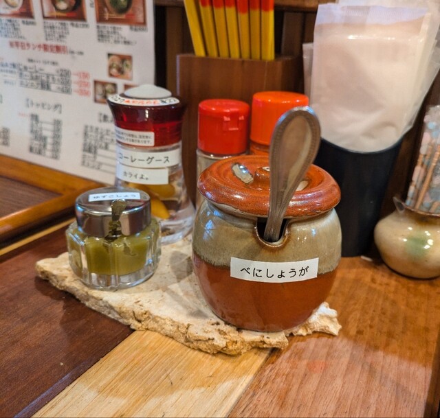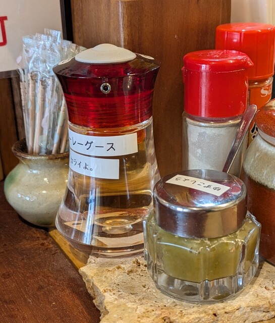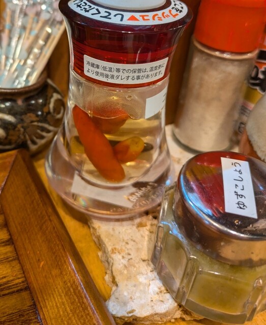 今月2回目です。週末のランチタイム、時間も12時20分です。船場のオフィス街はいつもより人が少ないですが?今回は?いつも通り、塩軟骨ソーキそば、背脂トッピングです。スープは鰹節、昆布、煮干しアサリに沖縄の塩ぬちまーすを合わせて、大量の背脂、魚介のあっさり背脂のコク美味しいスープです。麺は特製の平打ち中太麺、魚介スープに背脂が良く絡んで美味しいですね、かまぼこも程よく、青ネギの食感も良く、針生姜の風味も良く美味しいですね。大きな塩軟骨ソーキ、塩身も程よく軟骨とろとろ美味しいですね。卓上のコーレグース入れて、泡盛風味に島唐辛子がピリッとこれ又美味しいです。柚子胡椒入れて、柚子風味に青唐辛子がピリッと又々美味しいです。柚子胡椒は塩軟骨ソーキにもつけて脂身さっぱり美味しいです。卓上の紅生姜今回は入れて見ました。さっぱりして美味しいですね。魚介のあっさりに背脂のコク美味しい一杯でした。