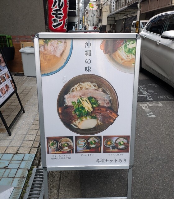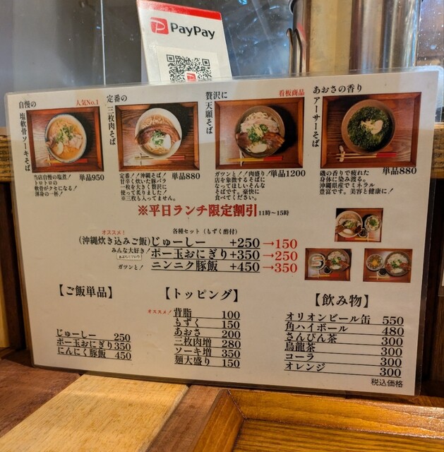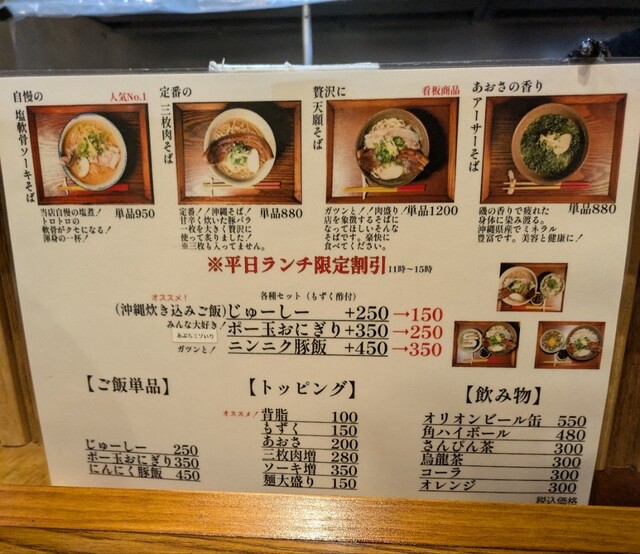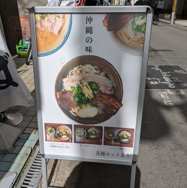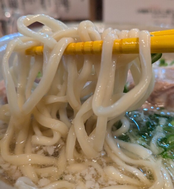 平日のお昼ごはんです。11時40分到着、この時間から結構なお客さんです。その後もどんどんお客さんですね。今回は?塩軟骨ソーキそば、背脂トッピングです。いつも通りです。鰹節に昆布、煮干しアサリから取られた魚介スープに沖縄の塩ちぬまーすえお合わせて、表面には大量の背脂です。魚介風味のあっさりスープに背脂のコクが重なる美味しいスープ。平打ち中太麺、喉越し良く、あっさりスープに背脂良く絡んで美味しいです。青ネギの食感も良く。生姜の風味も良いですね。かまぼこ美味しいです。塩軟骨ソーキ、大きのが2切れ、軟骨とろとろ、柔らかく塩身も程よく美味しいです。卓上のコーレグースちょいと入れて泡盛風味にちょいとピリッとこれ又美味しい。柚子胡椒も入れて柚子風味に青唐辛子のピリッと感これ又美味しいです。塩軟骨ソーキにも柚子胡椒、コーレグースかけて、ピリッと感が良くあって又々美味しいです。あっさりスープに背脂、とろとろ塩軟骨ソーキの美味しい一杯でした。11月17日には本町にも新店オープンするそうです。
