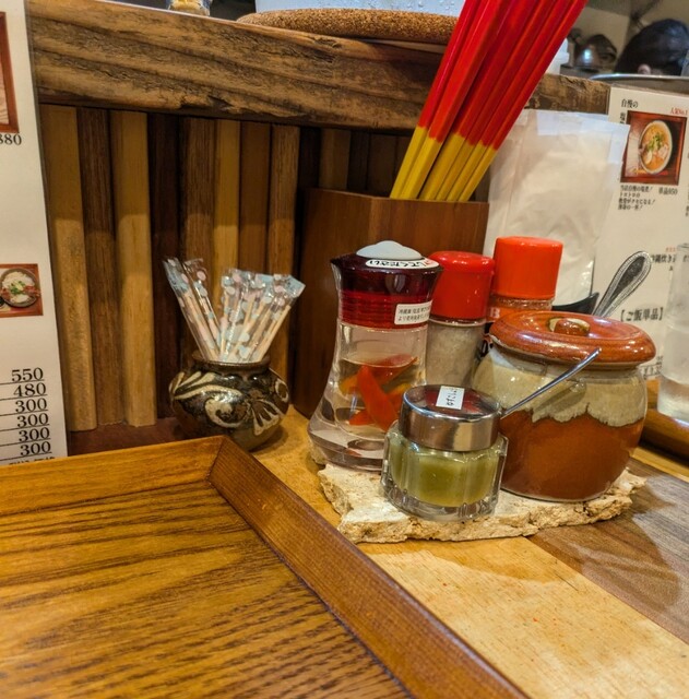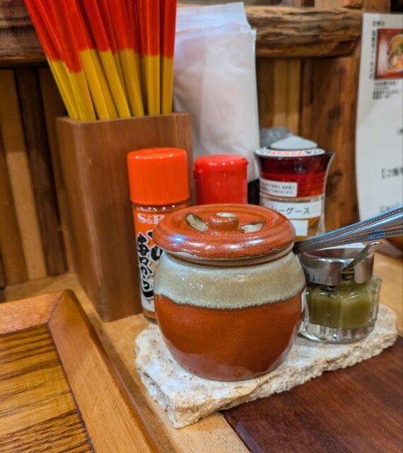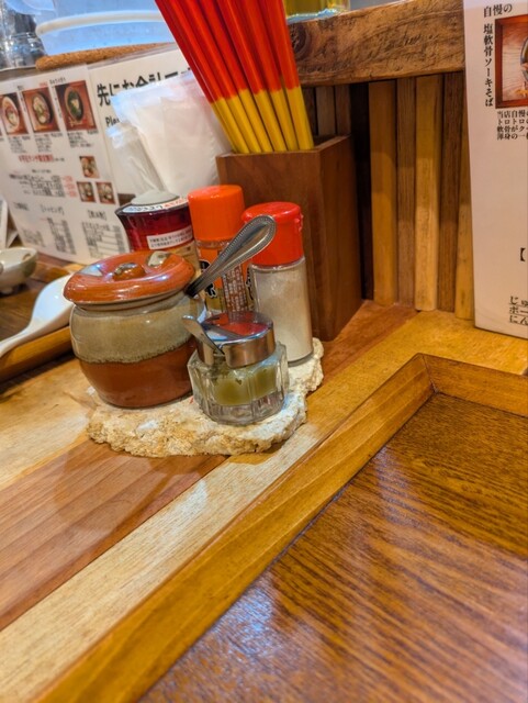 ゴールデンウイーク明けのランチタイムです。時間も12時半頃、南船場はランチ難民であふれてますね。店内はもちろん賑わいです、スタンプカードを押してもらってからの。今回は?いつも通り。塩軟骨ソーキそばです。背脂ももちろんトッピングです。スープは鰹昆布出汁に沖縄の塩、ヨネマースの粗塩ぬちまーすを合わせて、アサリ煮干し。表面には大量の背脂です。あっさり魚介に背脂のこく美味しいスープです。麺は特製の平打ち中太麺。魚介スープに背脂が良く絡んで美味しいです。かまぼこも程よく、青ネギの食感良く、生姜風味が良いですね。大きな塩軟骨ソーキ、軟骨とろとろ美味しいです。卓上のコーレグース入れて、泡盛風味に島唐辛子がピリッと美味しいです。さらに辛い、あがあがこーれぐすーも入れて、辛さで痛いです。でもこれが癖になる美味しさ。さらに卓上のゆずこしょう入れて、柚子風味に青唐辛子が又々ピリッと又々美味しいです。塩身も程よい美味しい一杯でした。