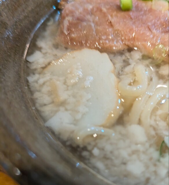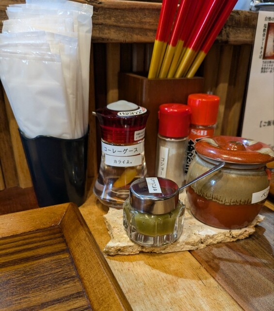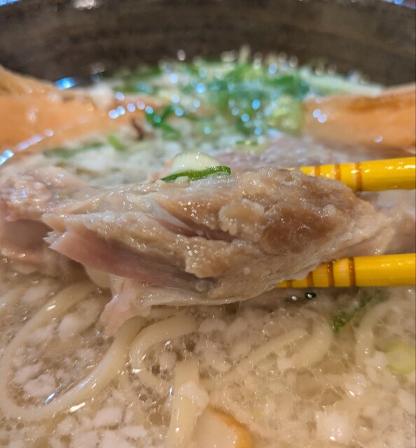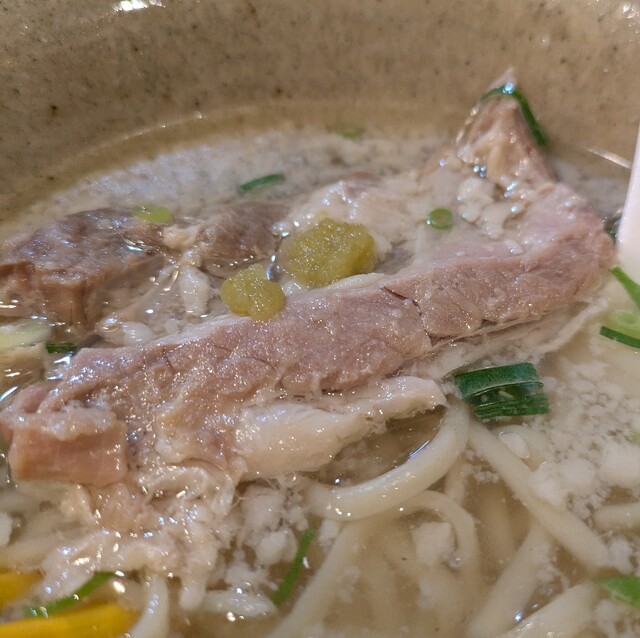 週末のお昼ごはんの訪問です。時間も午後1時過ぎた頃です。店内は先客数名、スタンプカード押してもらって、今回は?いつも通り、塩軟骨ソーキそば、背脂トッピングです。スープは鰹昆布出汁に沖縄の塩、ヨネマースの粗塩ぬちまーすを合わせて、アサリ煮干しのあっさり美味しいスープ、大量の背脂のコクも感じる美味しいスープですね。麺は特製の平打ち中太麺。鰹昆布出汁に背脂が良く絡んで美味しいです。青ネギの食感も良く、生姜の風味も良いですね。かまぼこも美味しいです。中央のでかい塩軟骨ソーキ、軟骨とろとろ美味しいです。卓上のコーレグース入れて、泡盛風味にちょいピリッとこれ又美味しい、ゆず胡椒も入れてゆず風味に青唐辛子がちょいとピリッと又々美味しいです。塩軟骨ソーキにもゆず胡椒つけて、辛さと風味でさっぱりとさらに美味しいです。今回じゃあげあげこーれぐすーおすすめされて?ちょっとだけ入れたのに、かなり辛い、辛さより痛さを感じてこれは辛いです。ですが何か癖になる辛さ、あとから美味しくなりました。今回のとろとろソーキの美味しい一杯でした。