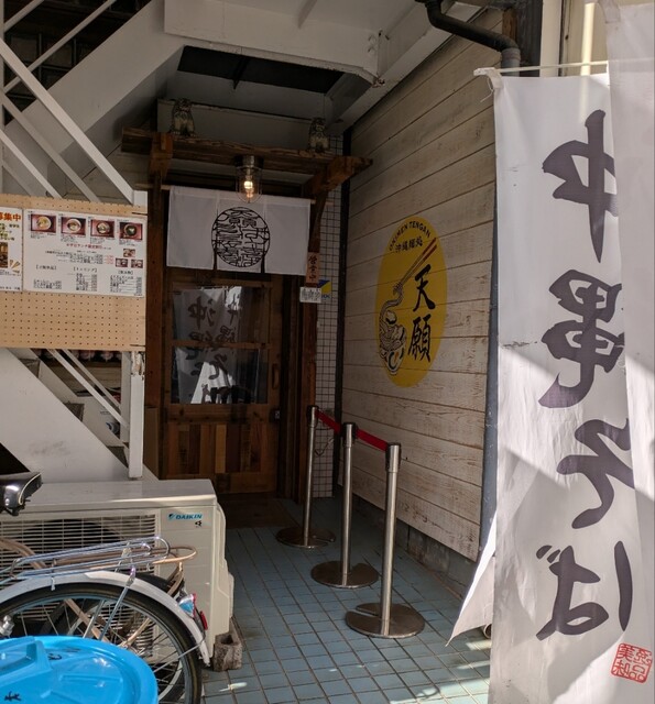 平日のお昼ごはんです。時間もちょうどランチタイムです。行列はありませんが?店内満席、しばらく外で待つことに、その後は僕の後ろにも行列です。数分で店内に。今回は?贅沢メニュー。天願そばです。背脂もトッピングです。スープは鰹節昆布煮干しアサリにちぬまーす合わせた魚介スープ、表面には背脂、。麺は特製の平打ち中太麺です。あっさり魚介に優しい塩身、背脂のコクも加わる美味しいスープ、平打ち中太麺に魚介スープに背脂が良く絡んで美味しいです。ネギの食感も良く、生姜風味もいいですね。かまぼこも美味しいです。三枚肉も甘辛い味付け美味しいですね。軟骨塩ソーキ、とろとろで塩身もちょうど良く美味しいです。卓上のコーレグース入れてちょいとピリッと、泡盛風味いいですね。柚子胡椒もちょい入れて、青唐辛子のピリッと感、柚子風味も良く美味しいです。魚介に背脂のあっさりコク深い美味しい一杯でした。