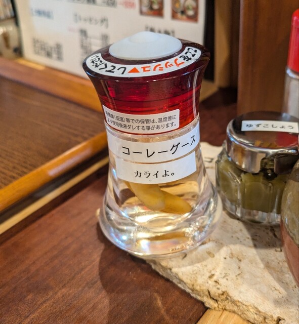 心斎橋でちょいと用事して、その日のお昼ご飯です。時間もちょいと早めの午前11時半です。この時間でも賑わう店内、今回は?いつも通り。塩軟骨ソーキそば。背脂トッピングです。スープは鰹昆布出汁に沖縄の塩ヨネマースの粗塩ぬちまーすを合わせて、アサリ煮干しのあっさりスープ、背脂のこくも加わる美味しいスープ。麺は特製の平打ち中太麺。魚介スープに背脂が良く絡んで美味しいです。青ネギの食感も良く生姜の風味も良いですね。かまぼこも美味しいです。卓上のコーレグース入れて泡盛風味に島唐辛子がちょいとピリッと美味しいです。ゆずこしょうも入れて柚子さっぱり青唐辛子もピリッと又々美味しいです。大きな塩軟骨ソーキ、柔らかく軟骨とろとろです。塩身も程よく美味しいです。塩軟骨ソーキにもゆずこしょうつけてちょいとさっぱり。卓上のあがあがこーれくす〜もついついちょっとだけ入れて、やっぱり辛い、痛いでも癖になる美味しいです。とろとろ塩軟骨ソーキに辛いコーレグースの美味しい一杯でした。