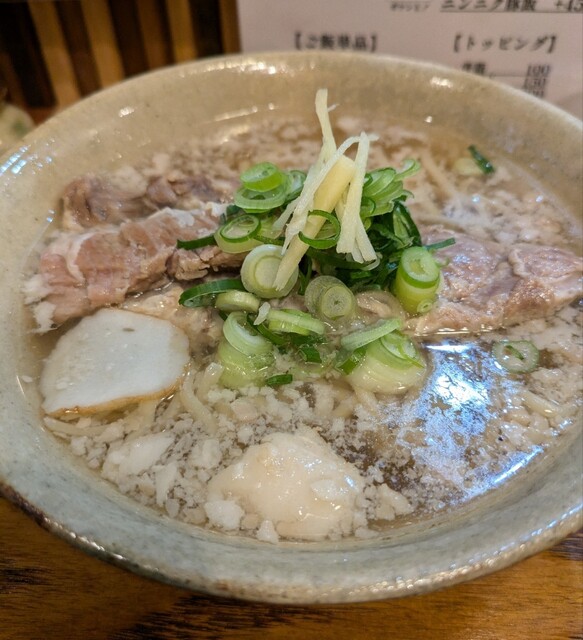 平日のランチタイムの訪問です。何と店頭は行列です。最後尾に並んで待つことに。その間にメニュー確認して、約10分程で席に。今回は?いつも通り。塩軟骨ソーキそば、背脂トッピングです。スープは鰹昆布出汁に沖縄の塩、ヨネマースの粗塩ぬちまーすにアサリ煮干し、表面には大量の背脂、あっさり魚介スープに背脂のコク、美味しいスープです。麺は特製の平打ち中太麺、あっさり魚介スープに背脂が良く絡んで美味しいです。青ネギの食感良く、生姜の風味も良いですね。かまぼこも美味しいです。中央のでかい塩軟骨ソーキ、軟骨とろとろ、塩身も程よく美味しいです。卓上のコーレグース入れて、泡盛風味に島唐辛子がちょいとピリッとこれ又美味しい、卓上のゆず胡椒入れてゆず風味に青唐辛子が又々ピリッと又々美味しいです。とろとろ軟骨に背脂のコク魚介ですっきり美味しい一杯でした。