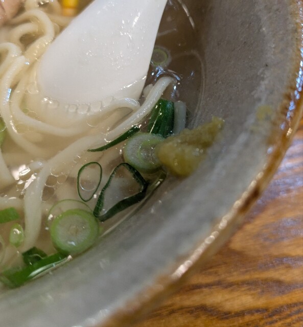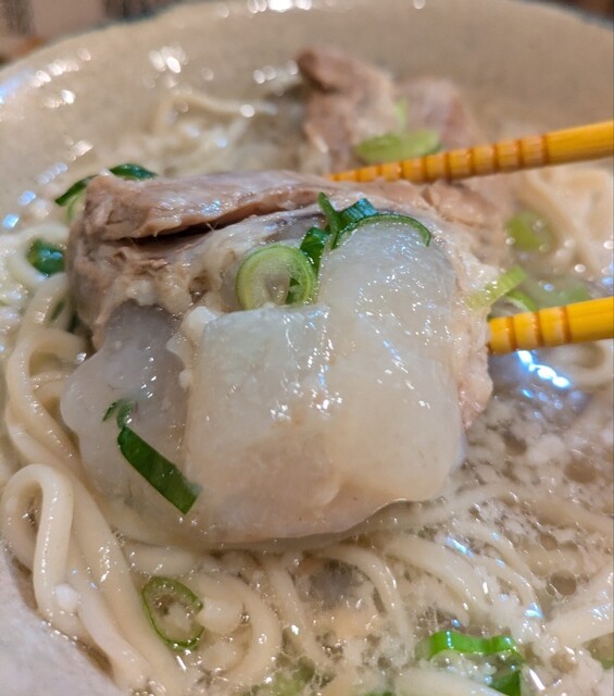 平日のお昼ごはんです。12時20分到着、この時間から結構なお客さんです。その後もどんどんお客さんですね。今回は?塩軟骨ソーキそば、背脂トッピングです。いつも通りです。鰹節に昆布、煮干しアサリから取られた魚介スープに沖縄の塩ちぬまーすえお合わせて、表面には大量の背脂です。魚介風味のあっさりスープに背脂のコクが重なる美味しいスープ。平打ち中太麺、喉越し良く、あっさりスープに背脂良く絡んで美味しいです。青ネギの食感も良く。生姜の風味も良いですね。かまぼこ美味しいです。塩軟骨ソーキ、大きのが2切れ、軟骨とろとろ、柔らかく塩身も程よく美味しいです。卓上のコーレグースちょいと入れて泡盛風味にちょいとピリッとこれ又美味しい。柚子胡椒も入れて柚子風味に青唐辛子のピリッと感これ又美味しいです。塩軟骨ソーキにも柚子胡椒、コーレグースかけて、ピリッと感が良くあって又々美味しいです。あっさりスープに背脂、とろとろ塩軟骨ソーキの美味しい一杯でした。