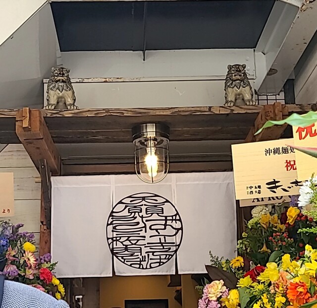 南船場でランチです。まだオープンまもない、店頭にはお祝いのお花ですね。時間も午後1時ちょいと過ぎです。僕の前には1人待ち、その後も行列に約10分程待って店内に、真新しい店内、今回は?贅沢天願そばです。沖縄そばの三枚肉、ソーキそばの塩ソーキも入った贅沢メニューです。スープは鰹昆布出汁に煮干しあさり、沖縄の塩を合わせた、あっさり美味しいスープです。麺は平打ちの中細麺、鰹昆布出汁のあっさりスープが良く絡んで美味しいです。青ネギの食感も良く、針生姜の風味も良いですね。三枚肉は炙ってあって香ばしく、塩ソーキ、軟骨とろとろこれ又美味しいです。この軟骨絶品ですね。オープン記念のジューシー(沖縄炊き込みご飯)もサービスで頂いて、これもさっぱり美味しいです。卓上の紅生姜、さっぱりですね。柚子胡椒も入れて、風味とピリッと感が美味しいですね。コーレグースも入れて?ちょいとピリッとこれ又美味しいです。沖縄そばにソーキそば、両方頂いてるような美味しい一杯でした。