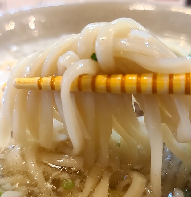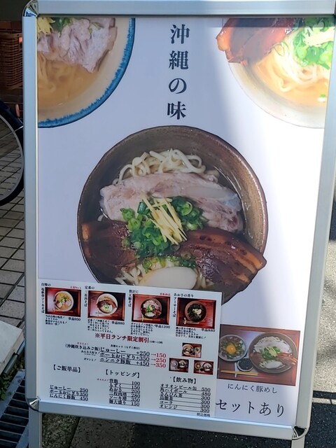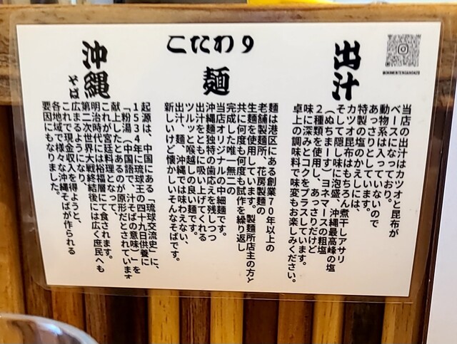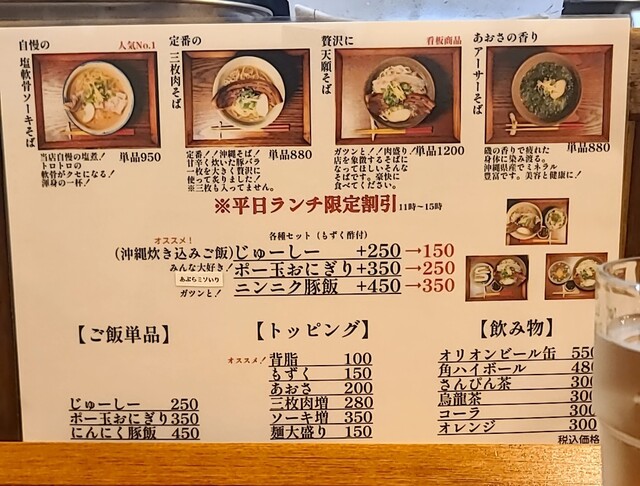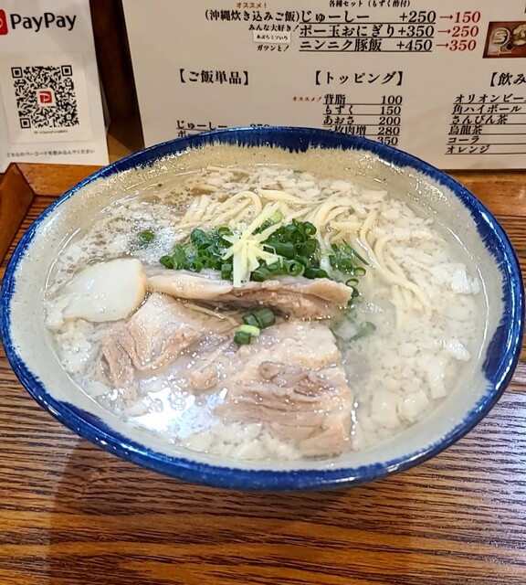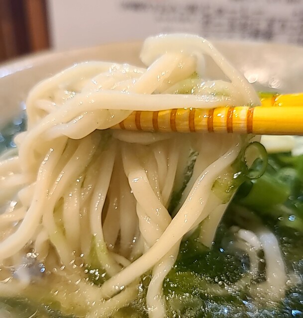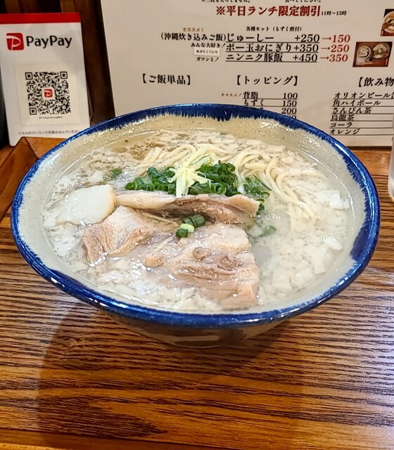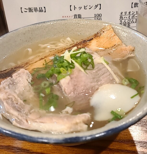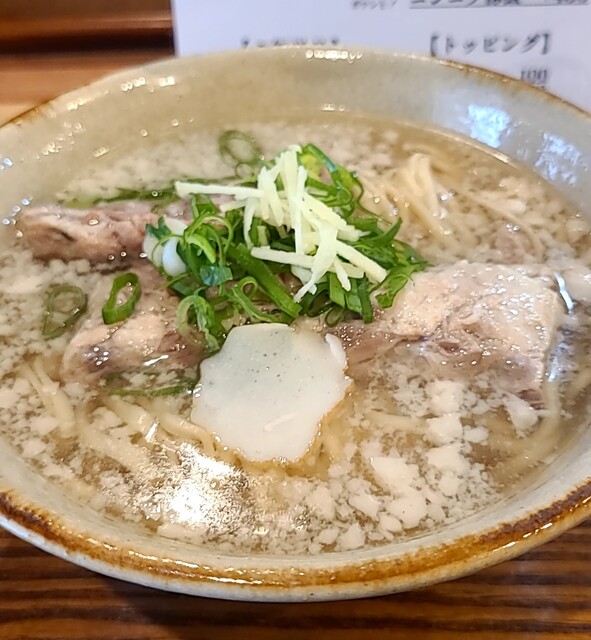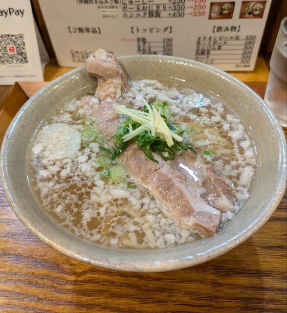 1ヶ月ぶりです。時間もランチタイムの12時30分です。店内は、満席でしたが?回転も良く、すぐに座れました。夏の冷やしは終わったみたいですね。今回は?塩軟骨ソーキそばです。背油もトッピングです。鰹節、昆布、煮干しアサリから取られたスープに沖縄の塩、ちぬまーすの塩タレ、あっさりですが、背油のこくも加わり美味しいスープですね。平打ち中太麺塩清湯スープ、背油が良く絡んで美味しいですね。ネギの食感も良く、生姜の風味も良いですね。かまぼこ美味しいです。塩軟骨ソーキ、塩身も程よくとろとろでこれ又美味しいです。卓上の柚子胡椒、ちょいと入れて、青唐辛子のピリッと感、柚子風味も良く美味しいです。塩軟骨ソーキにも柚子胡椒、とろとろソーキにちょいとピリッとこれ又美味しいです。沖縄の調味料コーレグースグースちょいと入れれ、泡盛風味に唐辛子のピリッと感、これが良く合う美味しいです。あっさりスープ背油のこくが良く合う美味しい一杯でした。