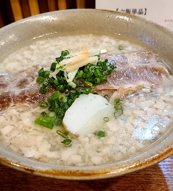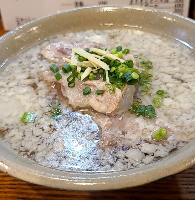 4月最終日のお昼ごはんです。時間も11時40分です。もう南船場はランチの行列がちらほら出来てますね。ここは今回2回目の訪問です。店内は結構な賑わいですね。何とか席は空いてて着席です。今回は?ソーキそばです。スープは鰹節に昆布、煮干しあさりを合わせた塩スープです。あっさりですがこくのある美味しいスープ、麺は平打ちの中太麺、魚介と昆布のあっさりスープが良く絡んで美味しいですね。青ネギの食感も良く、かまぼこが良いですね、針生姜の風味も良く美味しいです。途中で卓上の柚子胡椒入れて、柚子の風味に青唐辛子のピリッと感美味しいです。コーレグース唐辛子を泡盛に漬け込んだ調味料、ちょいとピリッとこれ又美味しいです。やっぱりここはソーキ、軟骨、塩煮込みでとろとろです。味付けもちょうど良く軟らかく美味しいですね。後入れで背脂も頂いて?あっさりスープに背脂のこく、おすすめだったので入れてみて正解です。とろとろソーキに背脂のこくの美味しい一杯でした。