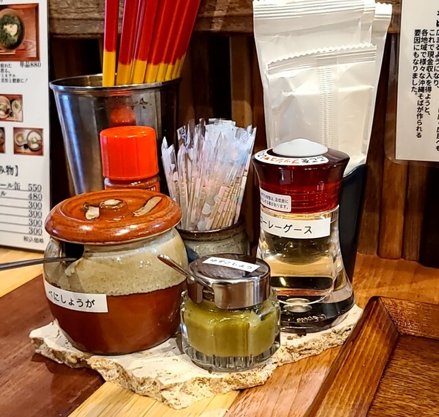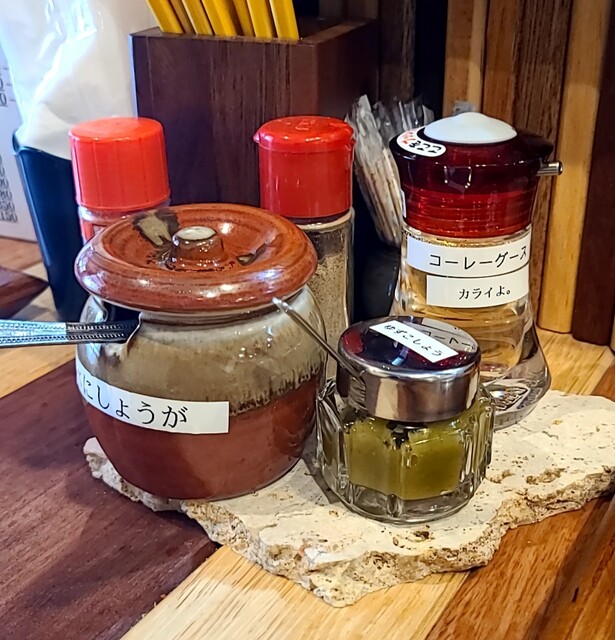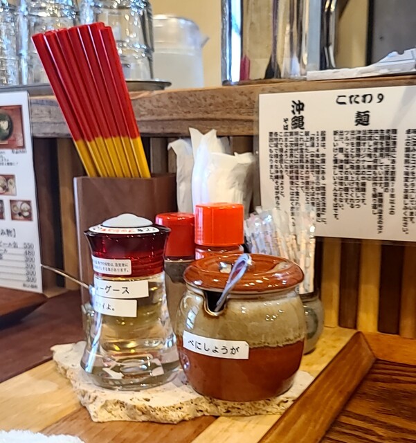 週末のお昼ごはんです。時間も少し遅めの午後2時の訪問です。先客数名、その後もお客さんですね。もうジューシーとポーク玉子おにぎりは売り切れのようです。今回は?もちろん?ソーキそば、背油トッピングです。鰹出汁に昆布を合わせて、煮干しアサリ、沖縄の塩ちぬまーすを合わせたあっさりスープ、表面背油のこくも重なり美味しいスープですね。麺は平打ちの中太麺、鰹昆布に背油が良く絡んで美味しいですね。かまぼこも美味しいです。青ネギの食感も良く、針生姜の風味も良いですね。とろとろソーキ、煮干し軟骨がとろとろで塩味も程よくこれ又美味しいです。卓上の柚子胡椒入れて、柑橘系の風味にちょいとピリッと。美味しいです。卓上のコーレグース、泡盛の風味とピリ辛感これ又美味しいです。あっさりに背脂、卓上アイテムも合わせた美味しい一杯でした。