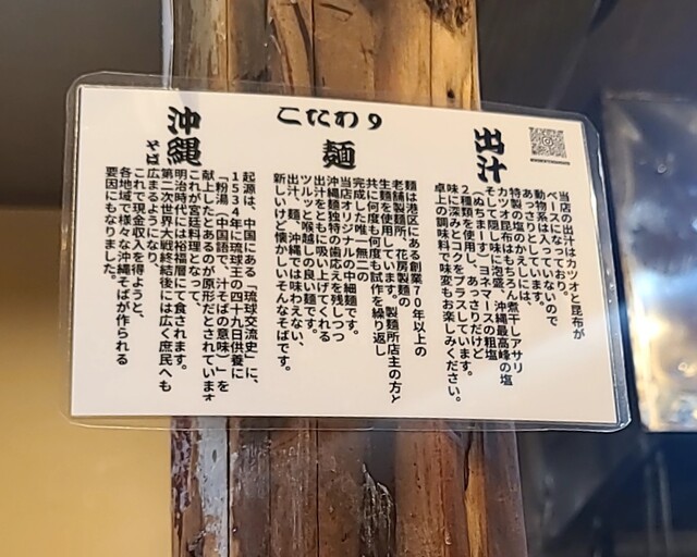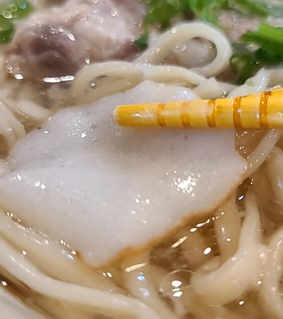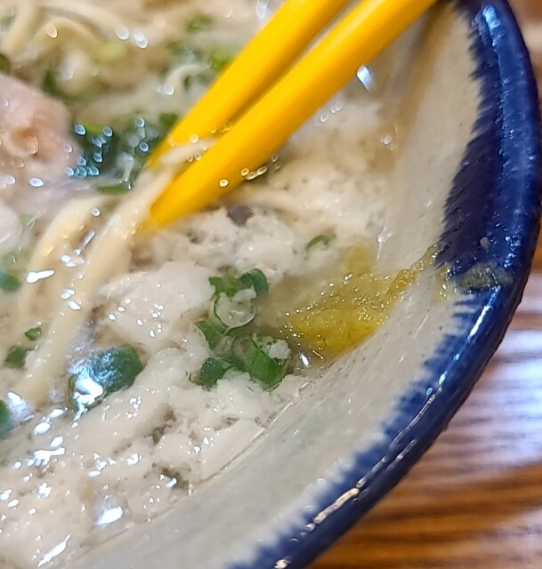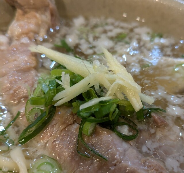 雨の降る南船場です。時間もランチタイム、時間も12時ちょいと前です。店頭は行列ですね。約10分程待って店内に。注文したら先払いです。今回は?ソーキそば、背油トッピングです。背油は前回頂いて美味しかったので?スープは鰹昆布出汁に煮干しアサリを合わせて、ちぬまーす沖縄の塩合わせた、さっぱりですが、しっかり旨味の美味しいスープ。背でこくも出て、さらに美味しいです。麺は平打ちの中太麺、魚介スープが良く絡んでこれ又美味しいです。針生姜の風味も良く、青ネギの食感も良いですね。かまぼこ美味しいです。そしてやっぱりここのソーキ、軟骨はとろとろで軟骨も軟らかく、塩味も程よくこれ又美味しいです。卓上の柚子胡椒で風味とピリ辛さを加えて、さらにコーレグース泡盛に唐辛子を漬け込んだ調味料、風味にちょいとピリッとこれ又美味しいです。軟骨とろとろの美味しい一杯でした。