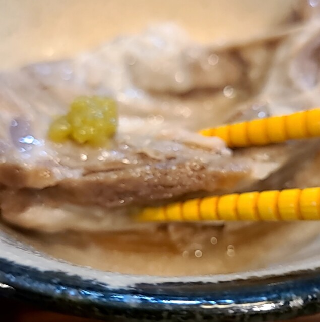 お盆休み、僕は用事で心斎橋に、ちょうどお昼後はの時間です。もちろんここに行くことは決めてましたが、時間も午後1時をちょいと過ぎです。店内は先客数名、今回は?塩軟骨ソーキそば、背油トッピングです。鰹昆布出汁に煮干しアサリをあわせて、沖縄の塩ちぬまーすを合わせたスープ、あっさりですが背油のコクが加わり美味しいスープですね。麺は平打ち麺、あっさり魚介に背油のスープが良く絡んで美味しいです。青ネギの食感も良く、生姜の風味も良いですね。かまぼこも美味しいです。メインの塩軟骨ソーキ、軟骨とろとろ塩味も程よく美味しいですね。卓上の柚子胡椒入れて柚子風味に、青唐辛子のピリッと感、良いですね。卓上のコーレグースかけて、泡盛風味に唐辛子のピリッと感、スープの味がしまってこれ又美味しいです。暑いので?冷やしにしようと思いましたが?今日の気分はこれだったので?とろとろソーキの美味しい一杯でした。