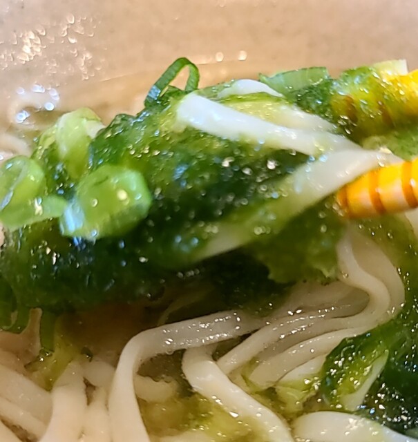 平日のお昼ごはんです。時間も午前11時40分到着です。先客数名、クーラーが新たに、涼しいです。今回は?夏の限定、冷やしアーサーそばです。別皿で塩ソーキ軟骨も頂いて。スープは鰹節、昆布、煮干しアサリの魚介系に沖縄の塩ちぬまーすを合わせた冷たいスープ、出汁の味が引き立つ美味しいスープ、水でしっかり〆られた平打ち麺、冷たいスープにアーサー良く絡んで美味しいですね。ねぎの食感も良く、かまぼこが良いですね。アーサーの風味も良く美味しいです。卓上のコーレグース入れて泡盛風味にちょいとピリッと美味しいです。柚子胡椒も入れてピリッと感と柚子風味。ソーキも軟骨とろとろで塩味も程よく美味しいです。ソーキにもコーレグース入れて、泡盛風味が美味しいです。柚子胡椒もつけて、辛さと爽やかさ、とろとろソーキに良く合いますね。冷たい美味しい一杯にとろとろ美味しいソーキでした。