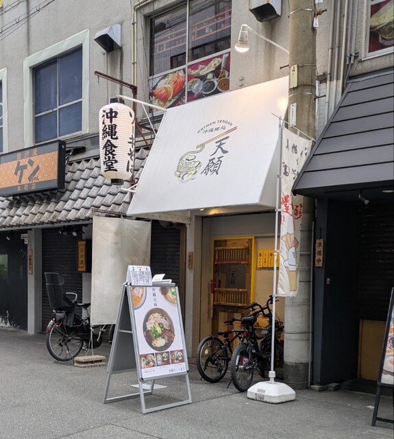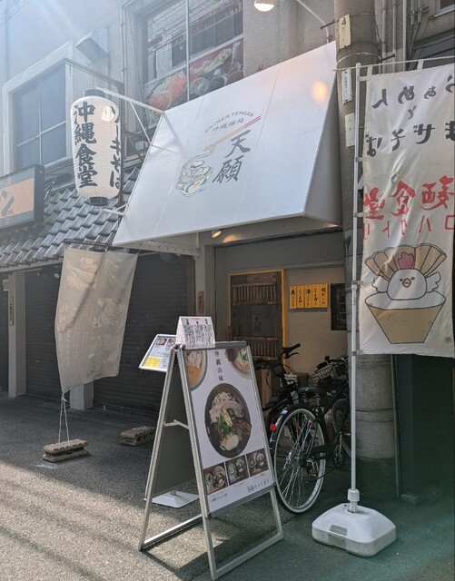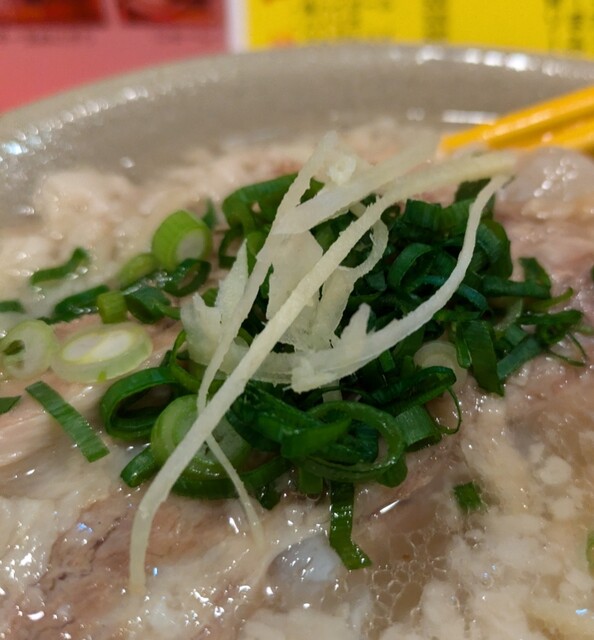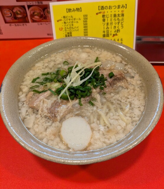 12月17日オープン、今回初訪問です。時間もランチタイムちょい過ぎ12時50分到着です。南船場は良く行きますが、店頭はお祝いのお花でいっぱいです。店内も結構な賑わいですね。今回は?いつものメニュー?塩軟骨ソーキそば、背脂トッピングです。スープは鰹節に昆布、煮干しアサリの魚介スープにヨネマース、ぬちまーす沖縄の塩を合わせて、表面には大量の背脂、あっさりですがコクある美味しいスープ。特製の平打ち中太麺、魚介スープ背脂良く絡んで美味しいですね。かまぼこも程よく、青ネギの食感、生姜の風味も良いですね。大きな塩軟骨ソーキ、軟骨とろとろ塩身も程よく美味しいです。卓上のコーレグース入れて、泡盛風味にちょいピリッとこれ又美味しい。柚子胡椒も入れて、柚子風味に青唐辛子ピリッ感又々美味しいです。塩軟骨ソーキにも柚子胡椒、とろとろ軟骨ソーキとも良く合って美味しいです。柔らかいとろとろ軟骨美味しい一杯でした。