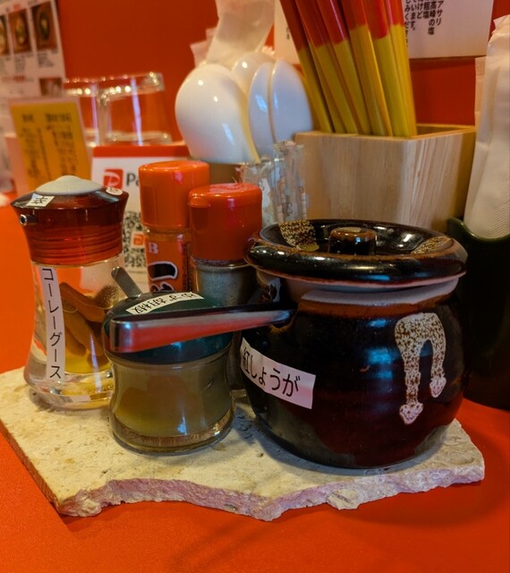 週末のお昼ごはんです。オフィス街なので、週末はすいてますね。時間も12時半過ぎです。今回は?もちろん、塩軟骨ソーキそば。背脂トッピングです。鰹昆布出汁にアサリ煮干しぬちまーすを合わせて、あっさり美味しいスープ、背脂でコクも出てこれ又美味しいです。特製の平打ち中太麺、魚介スープに背脂が良く絡んで美味しいですね。かまぼこも良いですね。青ネギの食感良く、生姜の風味がさっぱりです。中央も大きな塩軟骨ソーキ、軟骨とろとろ美味しいですね。卓上のコーレグース入れて、泡盛風味に島唐辛子がちょいとピリッとこれ又美味しいです。卓上の柚子胡椒も唐辛子、柚子風味に青唐辛子がピリッと又々美味しいです。塩軟骨ソーキにも柚子胡椒つけて、辛さと爽やかさでさっぱり頂けてさらに美味しいです。とろとろソーキに魚介出汁の美味しい一杯でした。