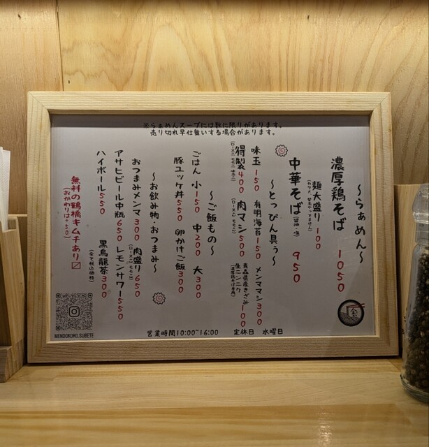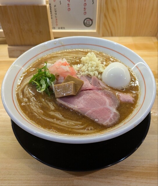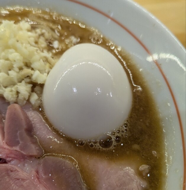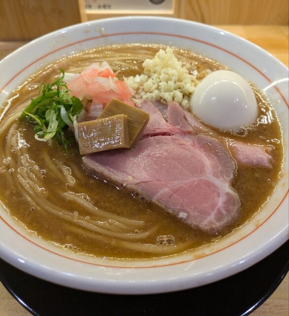 生野コリアンタウンで相方とお買い物、その前に、僕はお昼ごはんです。相方は先にコリアンタウンに僕は一人で訪問です。店内は先客数名、カップル客もいますね。お洒落な店内、今回は?前回と同じ。濃厚鶏そば。味玉に青森県産刻みニンニクトッピングです。スープは鶏をドロドロに煮込んだ鶏白湯スープ。醤油タレで、ドロドロ濃厚ですがくどく無く美味しいスープですね。麺や福はらの中細麺。喉越し良く。濃厚鶏白湯スープが良く絡んで美味しいです。青ネギの食感良く、四角い角切りメンマもコリコリ美味しいです、ほんのり甘味も、玉葱の酢漬け、酸味でさっぱりこれ又美味しいです。青森県産刻みニンニク、濃厚鶏白湯スープに良く合って、ガッツリニンニクのパンチ、又々美味しいです。レアチャーシュー2枚、肉々しく歯ごたえ良く、脂身も程よくこれ又美味しいです。卓上の胡椒投入、ちょいとピリッと又々美味しいです。有名店の流れを組む、濃厚ですがクオリティーの高い美味しい一杯でした。