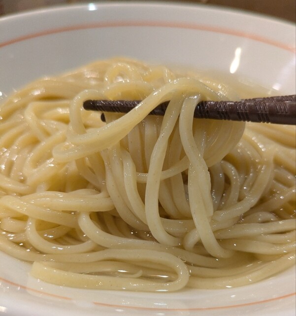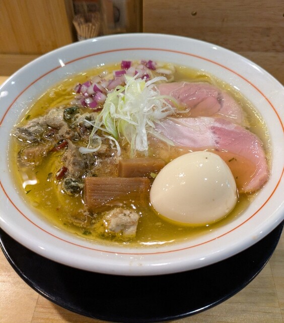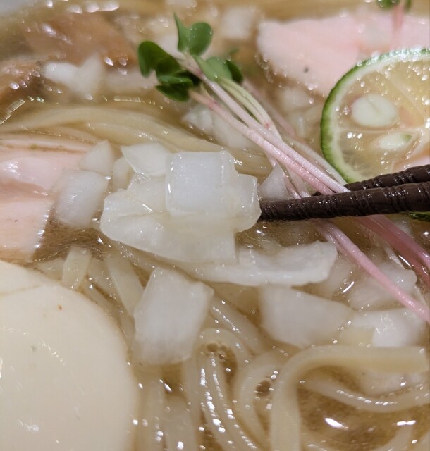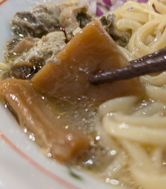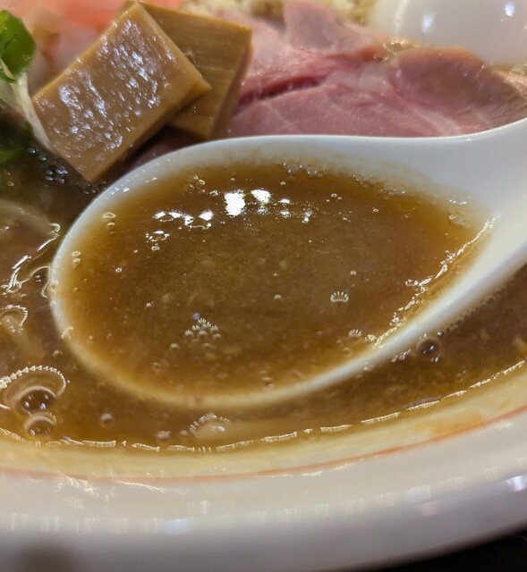 この日はお昼でも気温20℃までも上がらない、寒い日になりました、ついに長袖出して、ちょいと生野コリアタウンまで、時間も11時ちょい過ぎ、コリアタウン行く前の訪問です。店内は先客数名、その後もどんどんお客さんですね、今回は?限定、牡蠣のPepeらぁめんです。味玉もトッピングです。スープは澄んだ清湯スープに牡蠣の旨味が溶け込んだ濃厚牡蠣スープ、旨味しっかり美味しいです。麺は平打ちの中太麺、濃厚牡蠣清湯スープが良く絡んで美味しいです。青ネギの食感良く。紫たまねぎの甘味に食感も良いですね。角切りメンマもコリコリ美味しいです。トッピングした味玉も程よい味付美味しいです。レアチャーシュー2枚、豚ももチャーシューはジューシー肉々しく美味しいです。ロースのレアチャーシューも歯ごたえ良く又々美味しいですね。牡蠣美味しも入って、細切れ牡蠣にオイルにニンニク、唐辛子、ペペロンチーノ風の牡蠣美オイルがスープと混ざりさらに濃厚に、牡蠣のクセも残しつつ美味しいスープに。ガッツリ牡蠣の濃厚美味しい一杯でした。