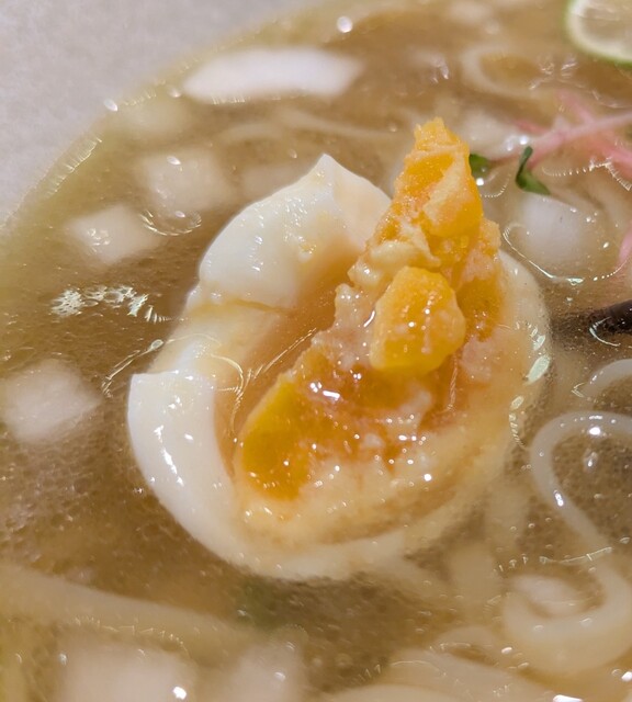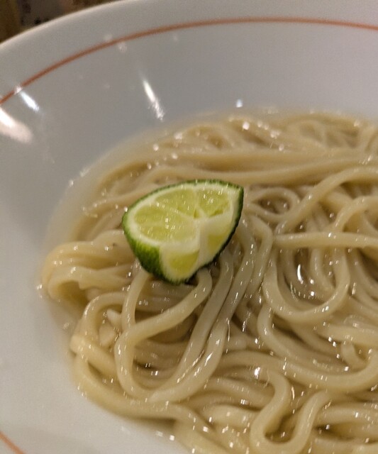 祝日です。世間は3連休最終日ですね。ですが?今週から又お盆休みのところも多いと思いますが?生野コリアンタウン、かなりの賑わい、やっぱり休みの日は人が多いですね。そんなコリアンタウンすぐそこですね。店内待ち1名、その後は、外にも待ちが出る状態です。数分席に。今回は?限定、鯖煮干し冷やしらぁめんです。塩で頂いて、味玉もトッピングです。暑いのでついつい、スープは良く冷えた、鯖煮干しから取られた、塩スープ、ガッツリ鯖を感じる結構濃厚な冷たい美味しいスープ。麺は水でしっかり〆られた平打ち細麺、ガッツリ冷たい鯖塩スープが良く絡んで美味しいですね。カイワレの苦味に刻んだ玉葱、食感良く甘味もあり美味しいです。柑橘系が冷やしには良く合います。トッピングした味玉も程よい味付美味しいです。今回は無料のキムチも頂いて、辛味と酸味、甘みも感じる美味しいキムチ、ちょうどよい箸休めです。鶏チャーシューは鶏ハムのような、ブラックペッパーがきいて、柔らかく美味しいです。鶏チャーシューのヘタも入って、肉々しく歯ごたえ良くこれ又美味しいです。ガッツリ鯖のきいた冷たい美味しい一杯でした。