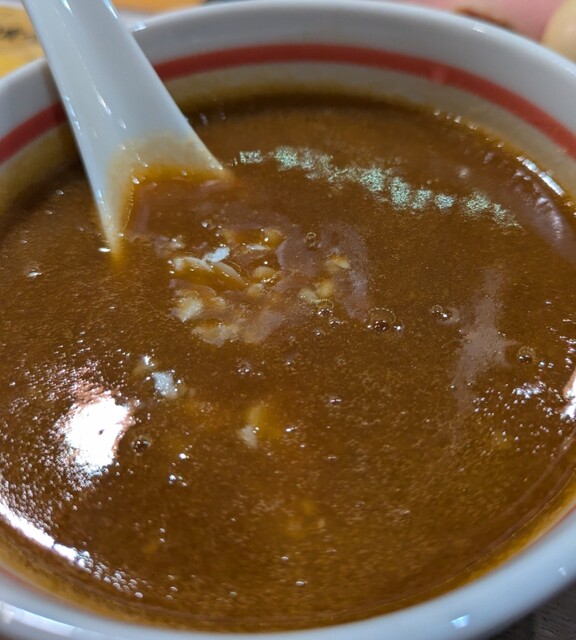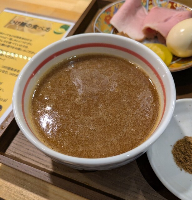生野コリアタウン入口近く、食べ終えた後は観光も出来るリッチです。鶴橋から歩いてもコリアタウンまでも色んなお店ありますが。時間も午前11時ちょい過ぎです。店内は先客数名、その後もどんどんお客さんです。カウンターに着席して、今回は?期間限定、つけ麺、濃厚Ver.味玉にニンニクトッピングです。麺は麺や福はらの中太麺、昆布水に浸かって、先ずはそのまま頂いて、風味の良い中太麺、昆布の旨味が良く絡んで美味しいです。スープは茶色の濃厚鶏白湯、とろみのついた濃厚スープ、鶏の旨味が凝縮美味しいです。濃厚スープに中太麺潜らせて、濃厚鶏白湯に昆布の旨味が加わり、良く絡んで美味しいですね。もちろんトッピングしたニンニク投入です、濃厚鶏白湯にニンニクは良く合いますね。添えてある別皿の節粉、投入すると、魚介鶏白湯スープに麺絡めてこれ又美味しいです。トッピングした味玉、黄身も程よく味付もちょうど良く美味しいです。濃厚鶏白湯スープに潜らせて又々美味しいです。レアチャーシュー2枚、肉々しく歯ごたえ良くこれ又美味しい、濃厚鶏白湯スープに潜らせて又々美味しいですね。麺を食べ終えると、残った昆布水を鶏白湯スープに投入、スープ割です。ちょうど良い濃さに。鶏白湯に昆布の旨味やっぱり美味しいです。最後は添えてある漬物頂いてさっぱりと。濃厚鶏白湯に昆布水の美味しい一杯でした。