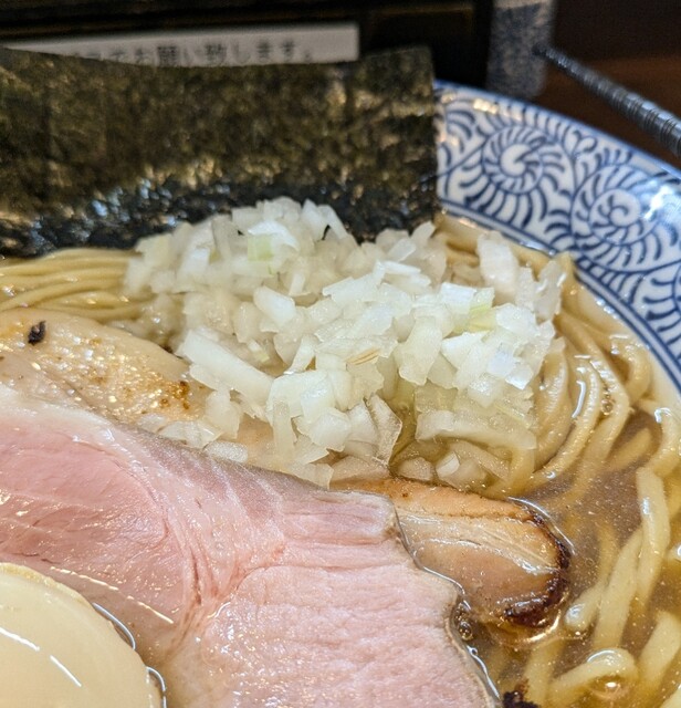 東大阪、俊徳道です。麺や福はらグループのお店ですね。今回初の訪問となりました。時間も12時ちょい過ぎです。店頭は行列です、約15分程で店内に。初めてなので、1番上のメニュー、今回は?特製煮干中華蕎麦ですたまねぎ増量トッピングです。スープは端麗煮干しスープに醬油タレ、煮干しの旨味にほんのり苦味も感じる美味しいスープです。自家製の平打ち中太麺ももちもちで煮干し醬油スープが良く絡んで美味しいです。海苔の風味も良く。特製の味玉、黄身とろとろ美味しいです。トッピングで増量した刻みたまねぎ、食感良く甘みも感じて煮干しスープと良く合って美味しいですね。肩ロースチャーシュー、肉々しく良く美味しいです。バラチャーシューも脂分ジューシー、柔らかくこれ又美味しいです。洗練された煮干しの美味しい一杯でした。