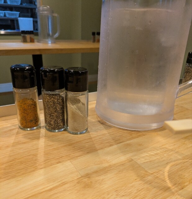 スープは冷たいシジミ清湯スープ、シジミの旨味に優しい塩身の冷たい美味しいスープ、麺は水でしっかり〆られた細麺、基本は中盛、冷たいシジミスープが良く絡んで美味しいですね。次はトマトと麺絡めて、イタリアンのような味わい美味しいです。刻み玉葱の食感に甘味も良いですね。シジミスープとトマト混ぜて麺と一緒に冷たく酸味甘味、これ又美味しいです。お勧めの頂き方、先ずは生クリームかけて、何とさらにイタリアン、生クリームが良く合う美味しいです。次はラー油かけて、ちょいとピリッとアラビアータみたいです。サーモンも冷たいスープ絡めてこれ又美味しい、生エビは味が付いてるのでそのまま頂いて、プリプリで又々美味しいです。さらに卓上のブラックペッパーかけて、又々ピリッとさらに美味しいです。最後は冷たいシジミスープにトマト、生クリームにラー油、ブラックペッパーも混ざり、刻み玉葱も一緒にちょいとピリッと又々美味しいです。空海で頂く変わり種な冷たい美味しい一杯でした。