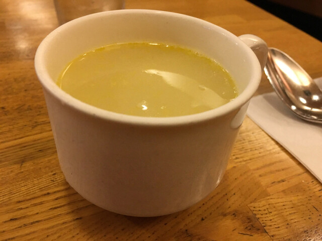 ポークカレー1,200円。黒っぽいルーは健在で深みのある味わい。コーンスープも安定した美味さ。福神漬けとの相性も抜群。