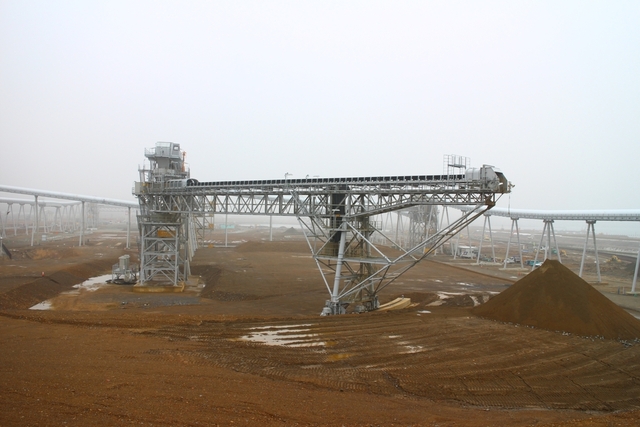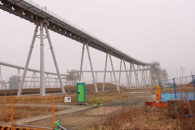 幹線道路は整備されているが、市街地の嵩上げのための土砂を運ぶベルトコンベアのタワーが建ち、