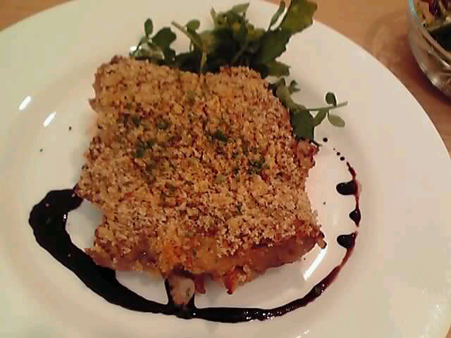 表面はパン粉をまとい香ばしくソテーされていて、中は瑞々しさを残しつつ生焼けではないちょうど良い火の通し加減。かみしめると肉汁とともにマスタードの香りがほのかに鼻にツンと抜けて、いい感じです。ソースはバルサミコ酢を使ったやや酸味のあるもの。この酸味が良い味のアクセントになっていますね。