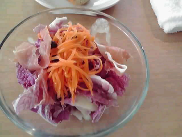 注文後、数分経つとサラダが来るのですが、この日は前回と異なり、紫色のサラダですね(野菜の名前が分からない・・w)。サラダの内容は定期的に変わるようです。副菜一つにもいろいろバリエーションがあって楽しいですね。