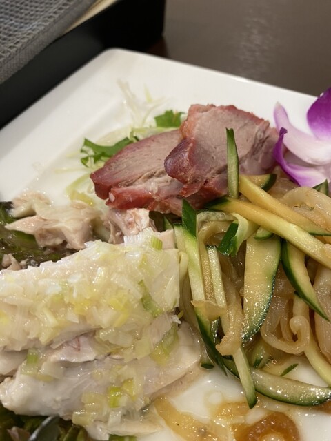 蒸し鶏もふんわり柔らかくチャーシューも六角の香りかほんのりとして美味しすぎて箸が止まらない。