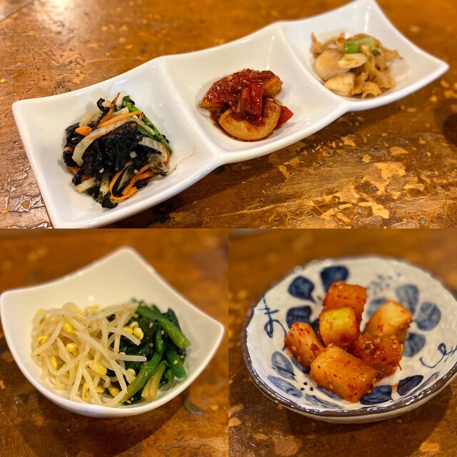 もやしナムル、さきいかキムチ、ほうれん草ナムル