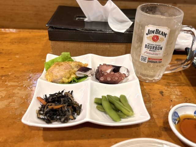 セル牡蠣のジョン、茶豆、蛸刺し、
