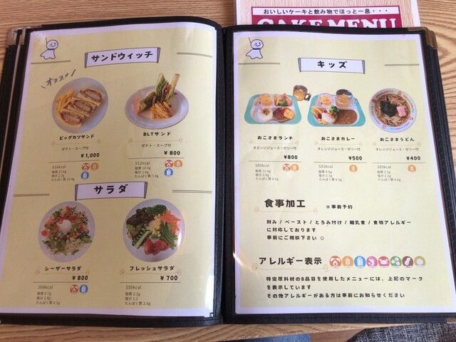 メニュー表は、カロリー、脂質、塩分、タンパク質、アレルギーの親切表示です。