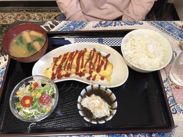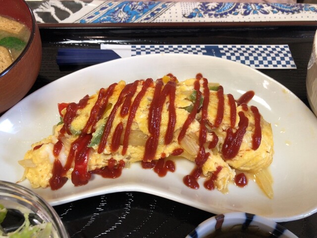ふわふわ玉子にタマネギ、ピーマン、パプリカ等入ったオムレツで美味しい。