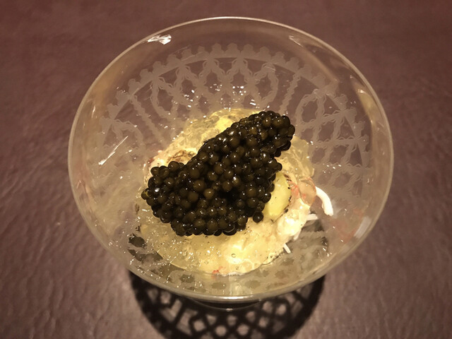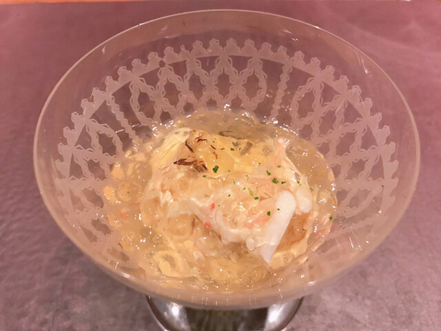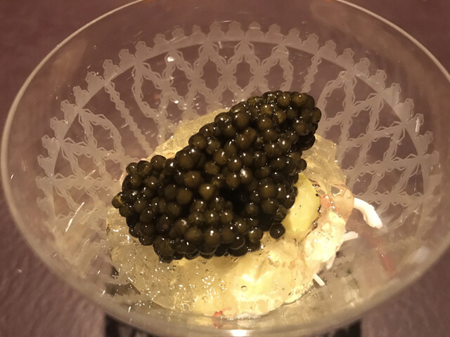 トマトガスパチョ。毛蟹とキャビア添えに香川県産ホワイトアスパラ