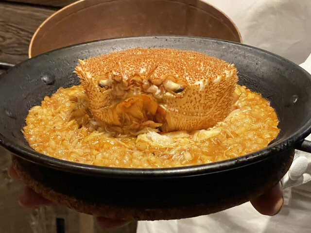 イカスミのパエリアの上に天草赤雲丹をたっぷり。