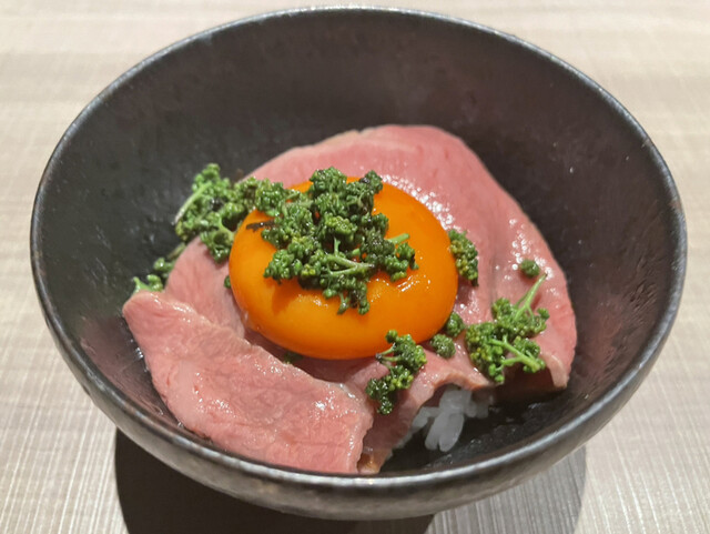 牛骨スープで炊いたご飯にヒレ肉、実山椒、食感にたくあんが入っています。