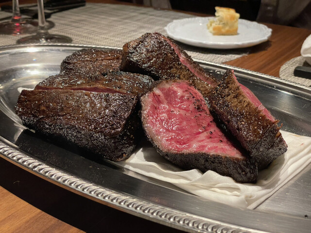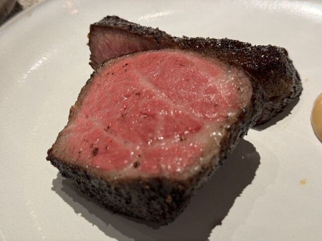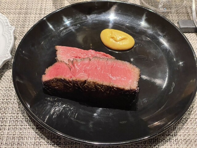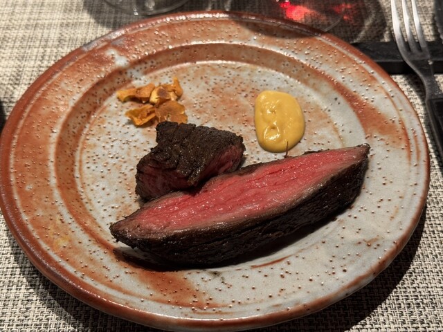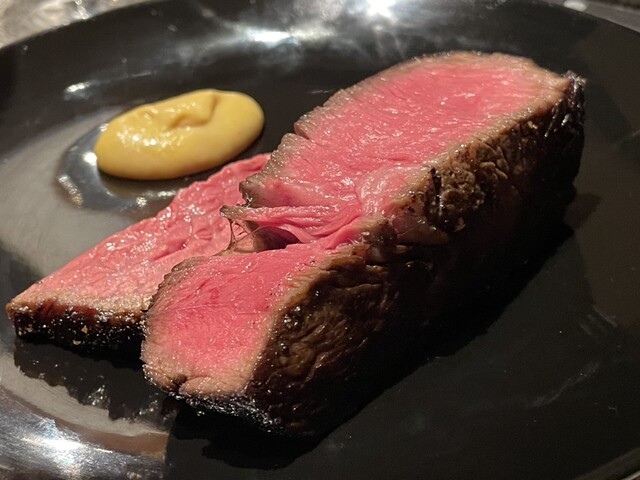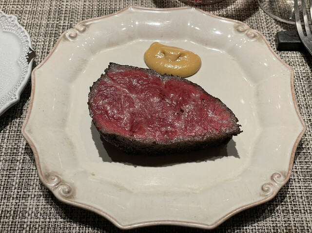 赤身っぽい方は焼き目の部分もしっかりあり、最高のワインと共に旨味をゆっくり味わう。